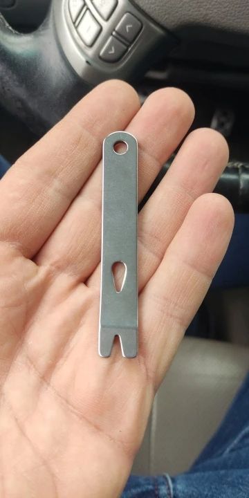 Длина 95 мм, гнезда под ключ от S8 до S17, толщина 2.5, спереди заточенный ласточкин хвост - фаски снимать и швы пороть. В руках не гнётся.