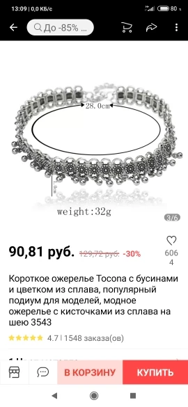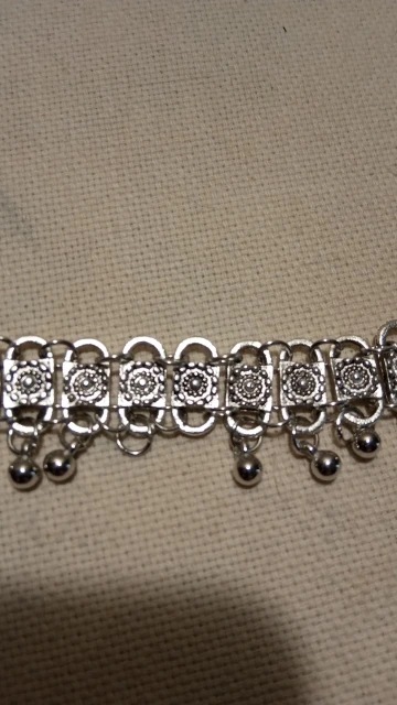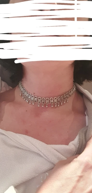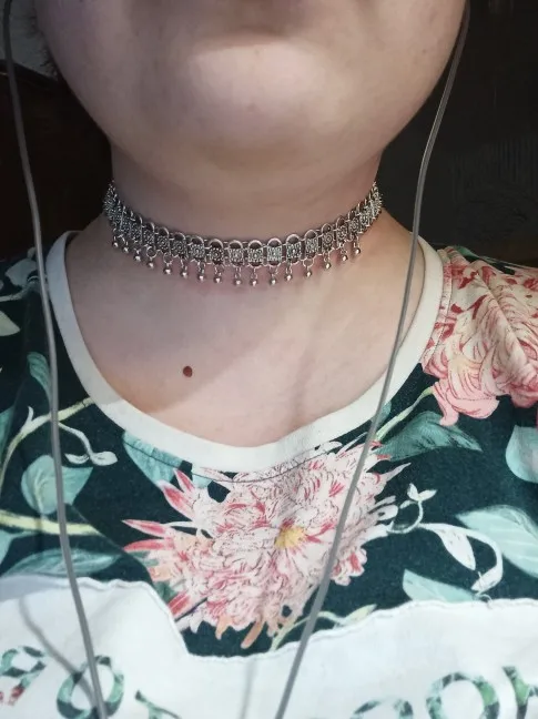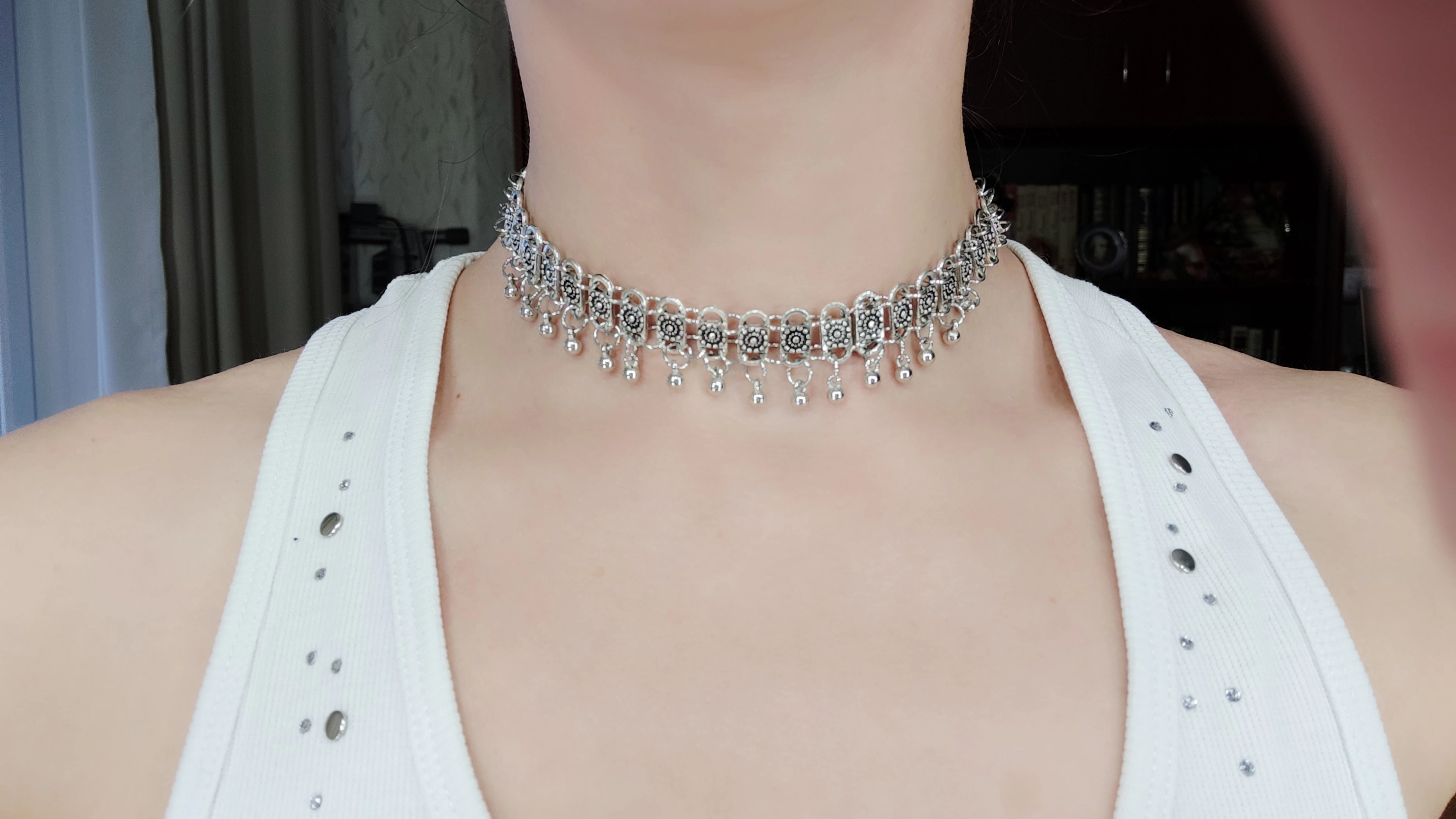 Чокер красивый, лёгкий. Нет одного шарика-висюльки прям посередине, придется перевесить сбоку. Думаю, что металл мягкий, и может скоро поломаться. Но я все равно довольна, если что можно еще заказать, цена позволяет.