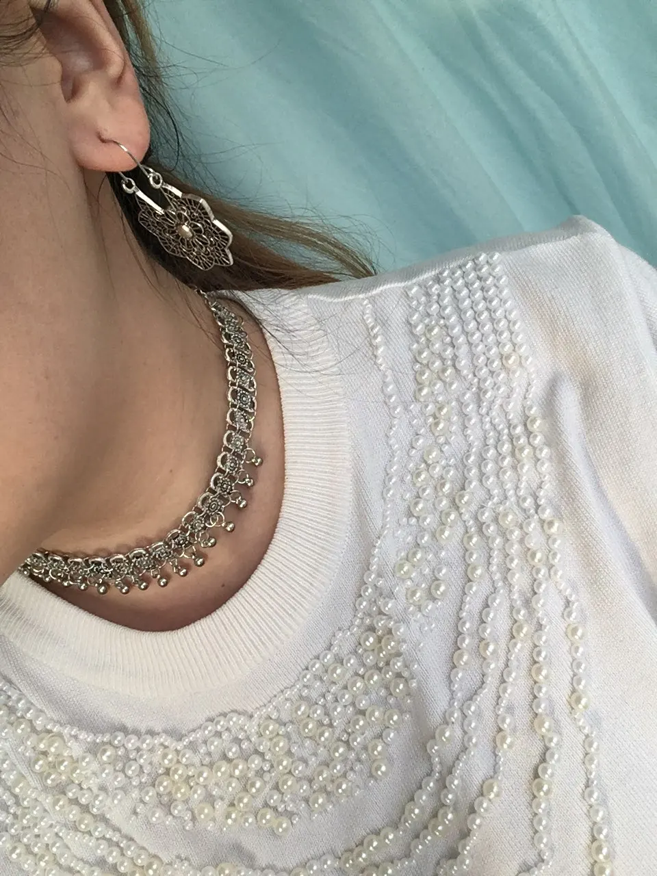 Это просто красивое и милое ожерелье, я купил его специально для ношения в индийском наряде, качество отличное, я заказываю 2 ожерелья, это Серебряное и светло-золотое ожерелье с маленькими подвесными серебряными бусинами, чокер, Доставка занимает один месяц, чтобы прибыть в США, Я заказал 20 ноября и получил его 21 декабря в моем почтовом ящике, продавец также очень отзывчив, хорошее общение, Я хотел бы дать это ожерелье 5 звезд за качество и доступная цена и хотел бы купить больше продуктов у этого продавца, спасибо