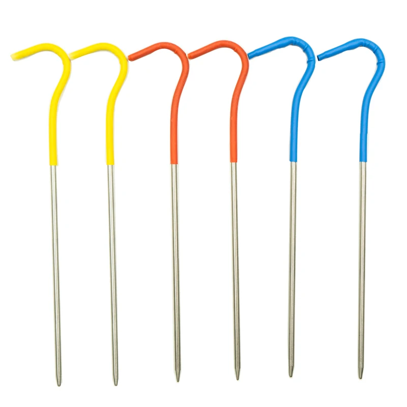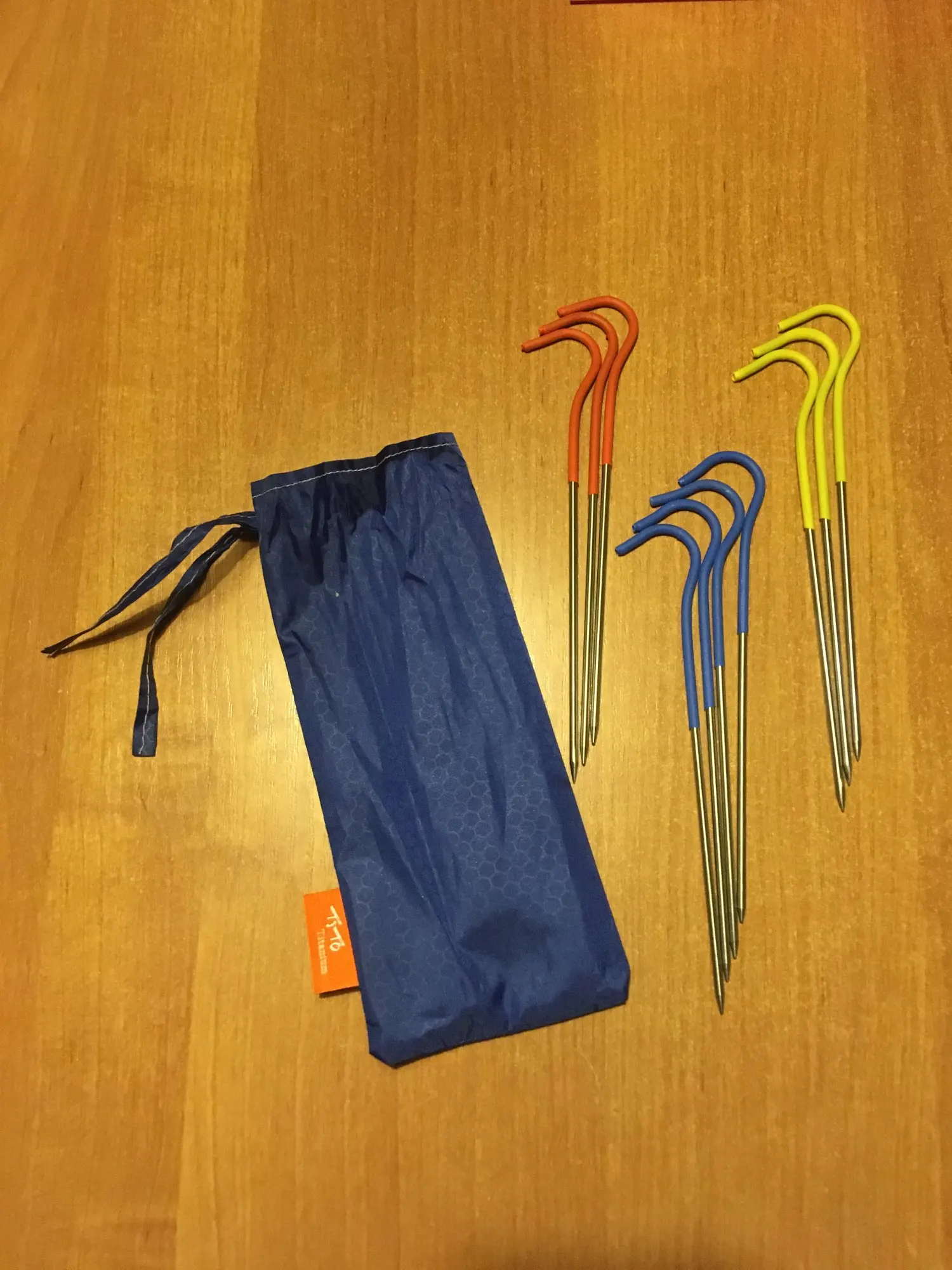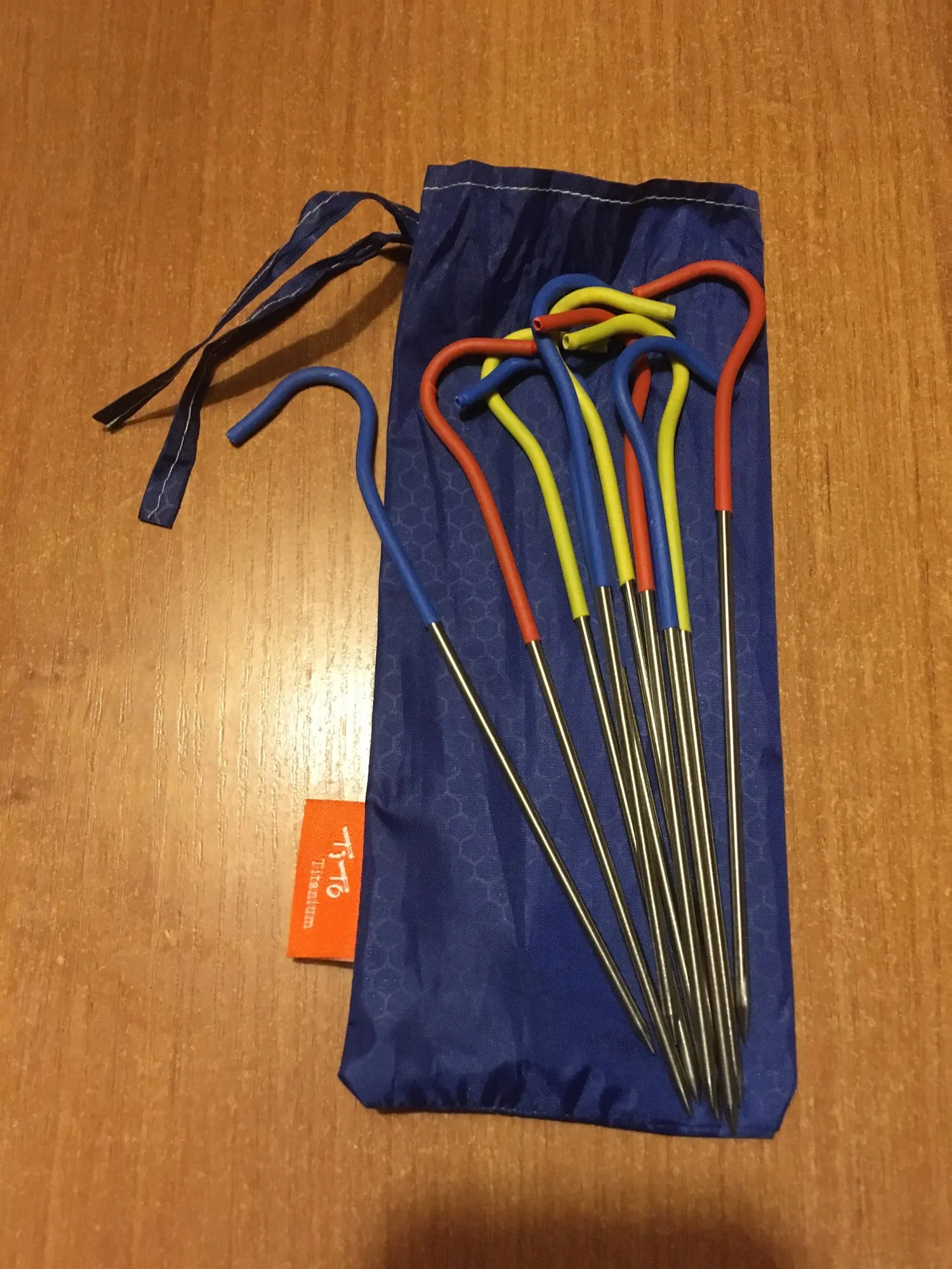 Отличные титановые колышки, по 6,2 г/шт. Прочный и легкий мешок для хранения 3,5гр. Но жаль, что мешок не с затяжным горлом, а с двумя тесемками, которые не удобно завязывать .качественное исполнение и быстрая доставка. До Санкт-Петербурга дошло за 16дней.
