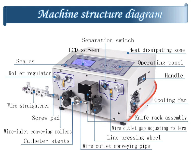 Наш продукт предназначен для использования в режиме общения с человеком-машиной с ЖК-экраном, с приятным внешним видом, простой работой, удобным обслуживанием, стабильной производительностью, скоростью, точностью и более высокими основными функциями. Длина провода может установить произвольные, thrum и параметры конца линии также могут в соответствии с запросом клиента изменить, различная степень отделки зачистки проводов, также имеет линию высокого напряжения линии, корпус ножниц и т. Д.