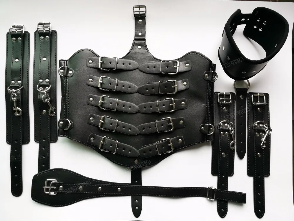 alors les menottes un peu petite mais dur a mettre. le corset âpres le premier serrage une attache s'est arracher. les rivets de maintien des sangles arrière ne sont pas solide.de plus faut pas dépasser 60kg sinon on aura du mal a le fermer .