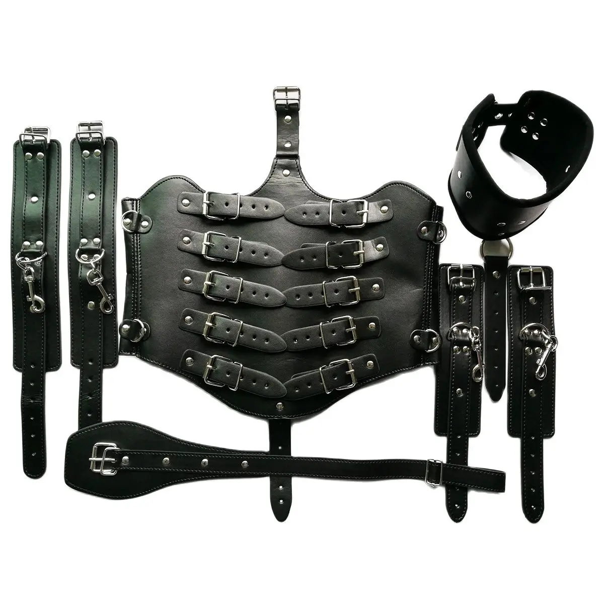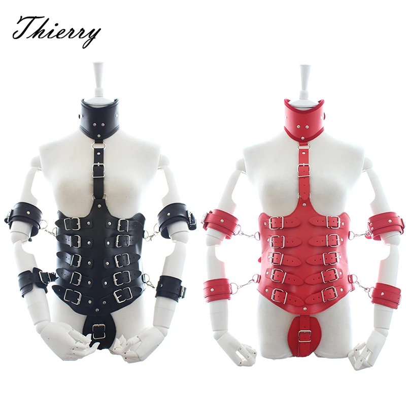 Тьерри Lockdown кожаный Cincher корсет, тело Связывание Straitjacket с наручники Шея воротник, жгут игры и игрушки для секса