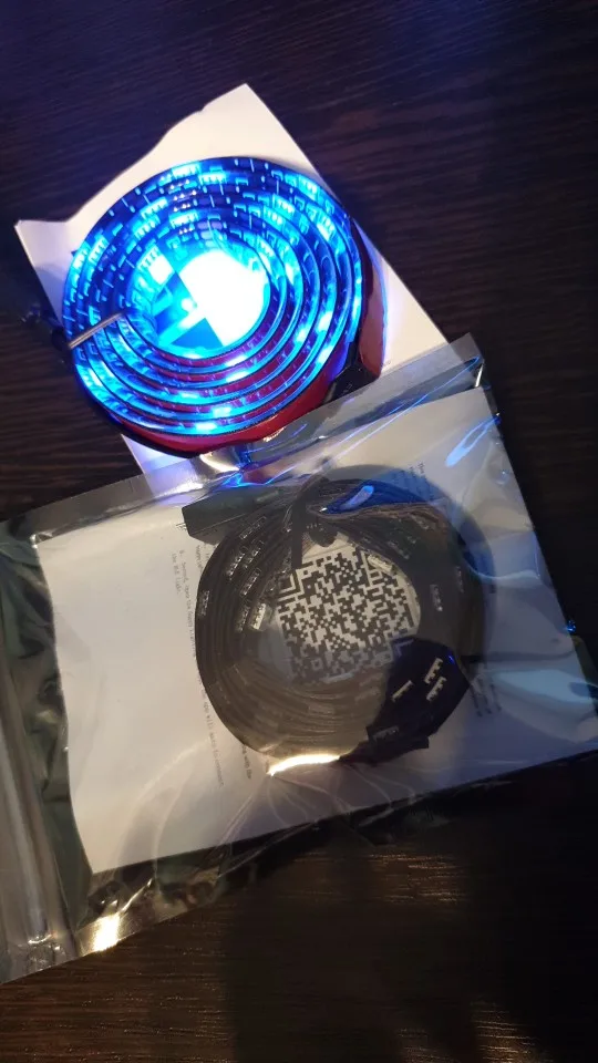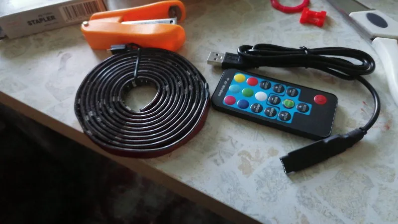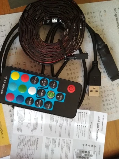 Забавная штука, но некоторые цвета немного искажают восприятие. Не знаю почему так. И синий цвет как ультрафиолет работает, можно под ним купюры на подлинность проверять, немного видно все эти цветные "волоски" в бумаге. Пожалел что взял не водозащищенную ленту. Обычную гнуть конечно легче, но смотрится не так красиво и пыль с неё гораздо тяжелее будет убирать. Для красивых стыков купил 4-х контактные уголки на 90°, но не крепил их пока, наклеял на монитор без них. Колхозно конечно получилось малость Тот факт что жопят батарейку вообще удивил, как так то, она стоит копейки, могли бы уж не жадничать так. Соединять ленту нужно стрелка к стрелке, учтите это!
