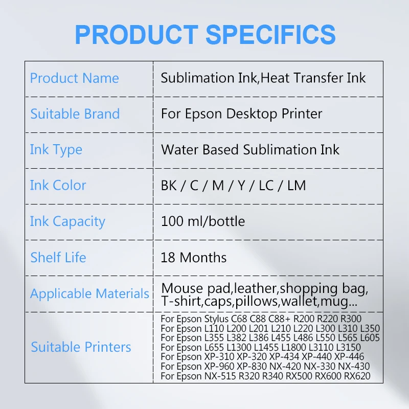 Название продукта: сублимационные чернила, чернила теплопередачиНазвание товара: сублимационные чернила для настольных принтеров EpsonТип чернил: сублимационные чернила на водной основеЦвет: BK / C / M / Y / LC / LMЗапах: без запаха, безвредный для человеческого телаОбъем бутылки: 100 мл/бутылкаСрок годности: 18 месяцевХарактеристики: безвредный, супер адгезия, Красивая глянцевая