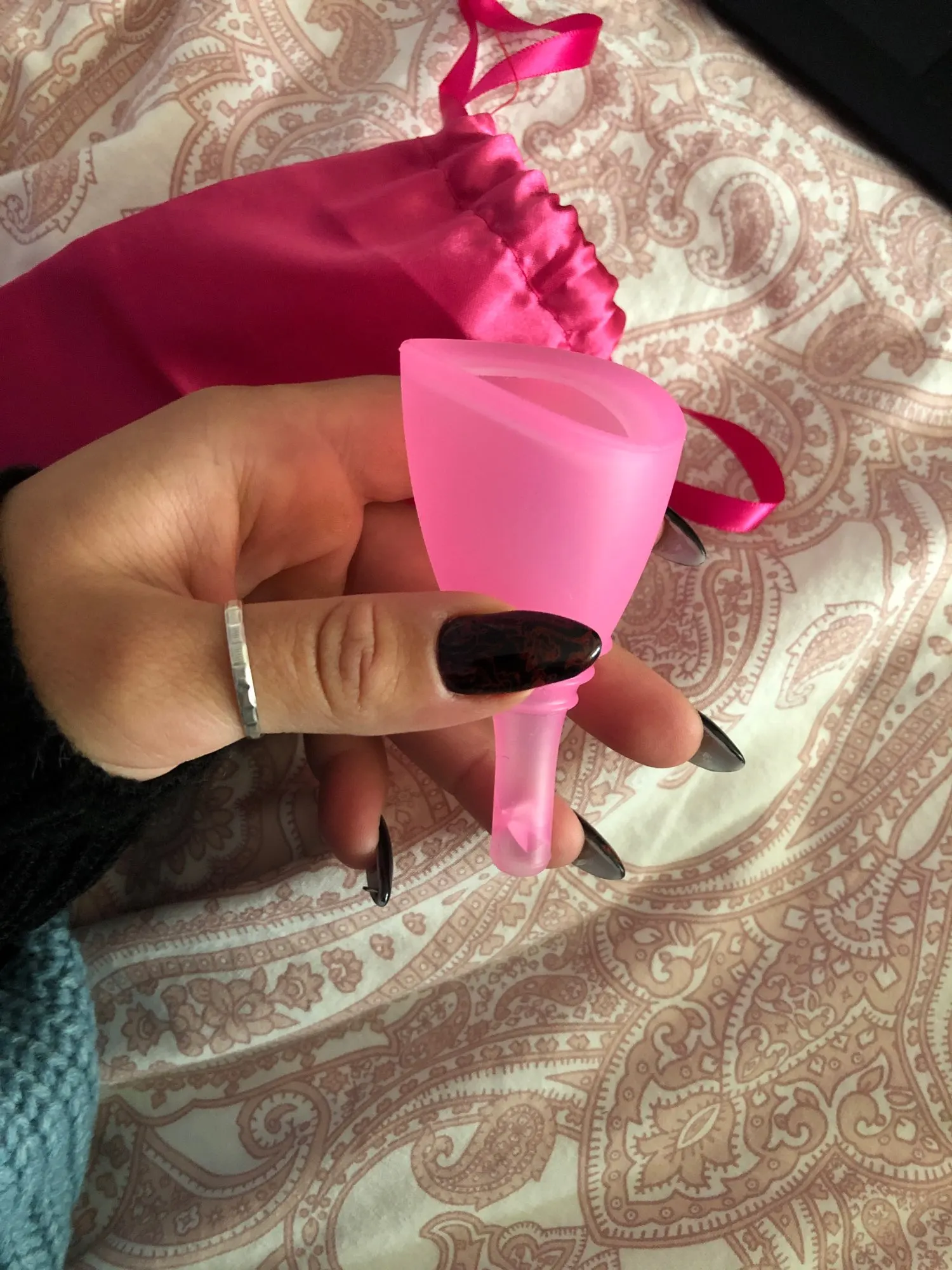 Прийшло в дуже гарному пакуванні, разом з прокладками багаторазовими. Мішечок так собі, не дуже мені сподобався, а капи уявлялися мені значно меншими, але розмір L, як і замовляла, значить такий має бути. Силікон доволі твердий, хвилююся, чи не буде гризти, муляти і т. д. Але побачимо, скоро протестую і напишу додатковий відгук.