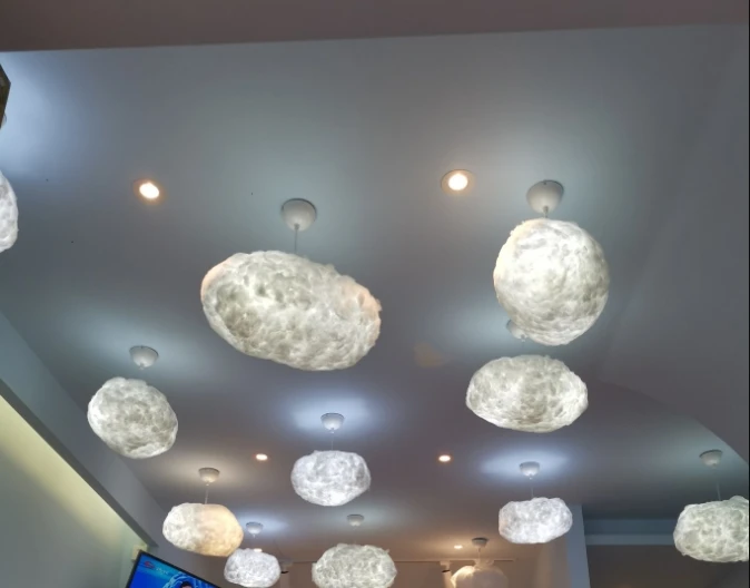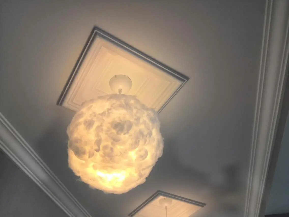 Все в целом я относительно доволен. Тем не менее, мой боязнь того, что облака немного не образуются. Когда они прибыли, они были в основном только в форме таблеток или картофеля. Благодаря некоторым изгибам, растягиванию и разрыву, я могу получить их в форме, с которой я несколько доволен. Всем интересно, что конструкция из пластиковой фольги приварена к форме, я уверен, что сверху приклеена полиэфирная шерсть. У меня пышная версия. Когда дело доходит до доставки, я понимаю, что это трудные времена, но после ожидания monty в обновлении моего статуса доставки я хотел бы узнать, что происходит. Ответ, который я получил, был в том, что он был отправлен и что веб-сайт не показывал его. Через несколько дней веб-сайт показывает, что посылка наконец была передана почтовой службе. Потолочный светильник входит в комплект и поставляется с большим кабелем.