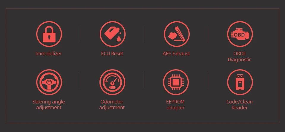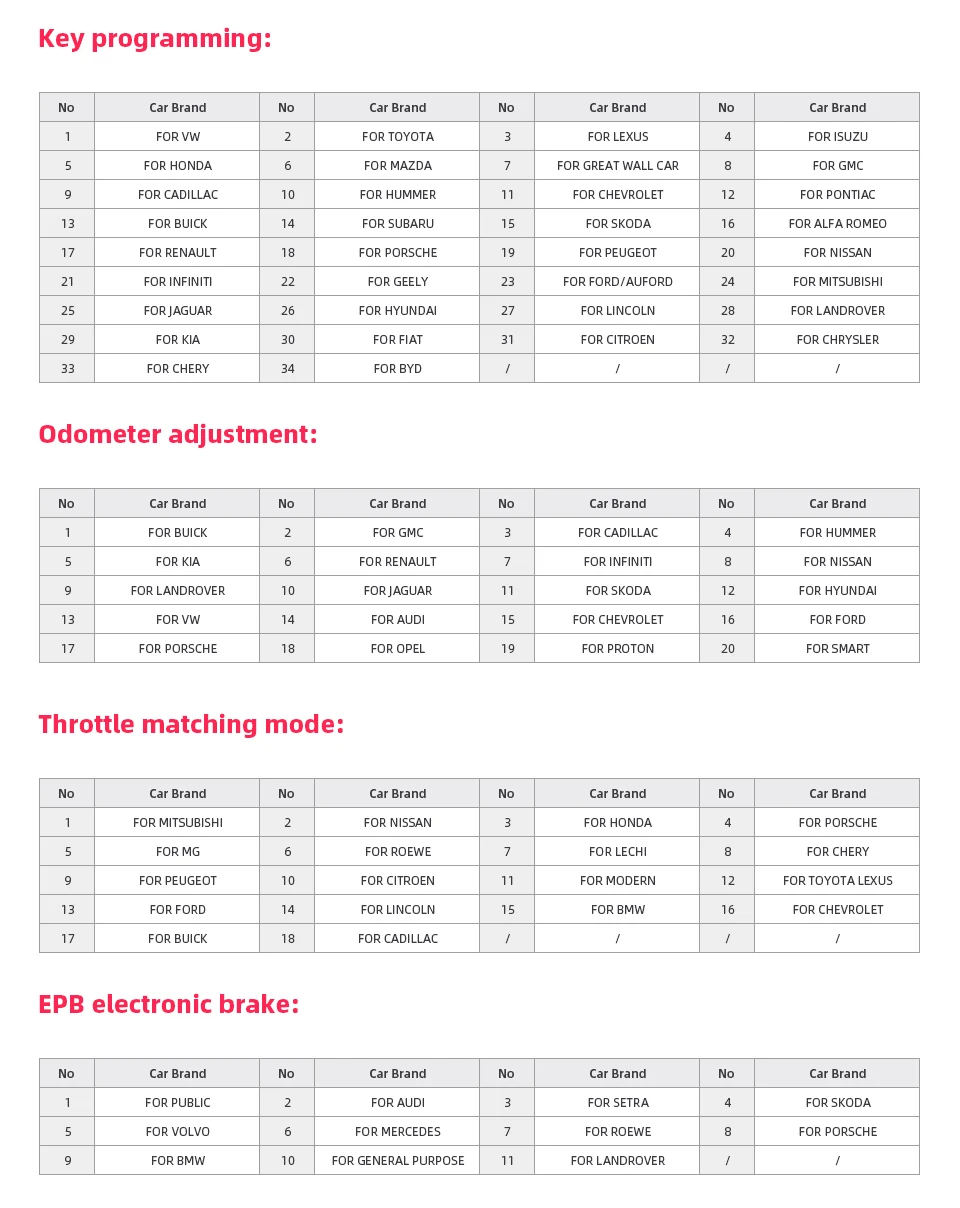 1. Программирование новых клавиш2. Считывание ключей из памяти иммобилайзера3. НОВОЕ программирование иммобилайзера4. НОВОЕ программирование ECU5. Новое механическое Программирование номера ключей6. Программирование идентификационного номера Автомобиля7. Сброс ECM и сброс иммобилайзера8. Легко управлять программированием меню9. НОВОЕ программирование пульта дистанционного управления10. С полной и надежной базой данных для наиболее важных автомобилей11. Обновление через веб-загрузку