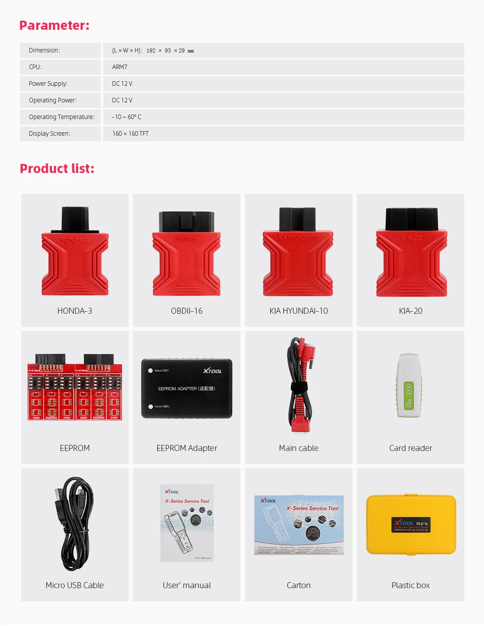 Список посылка тов программатора XTOOL X100 Pro2: 1 шт. x основной блок XTOOL X100 Pro21 шт. x Honda-31 шт. x OBDII-161 шт. x KIA Hyundai-101 шт. x KIA-201 шт. x EEPROM1 шт. x адаптер EEPROM1 шт. x адаптер питания 12 В/1 А1 шт. x основной кабель1 шт. x Кабель Micro USB1 шт. х адаптер питания США1 шт. х адаптер питания ЕСПластиковая коробка-1 шт.