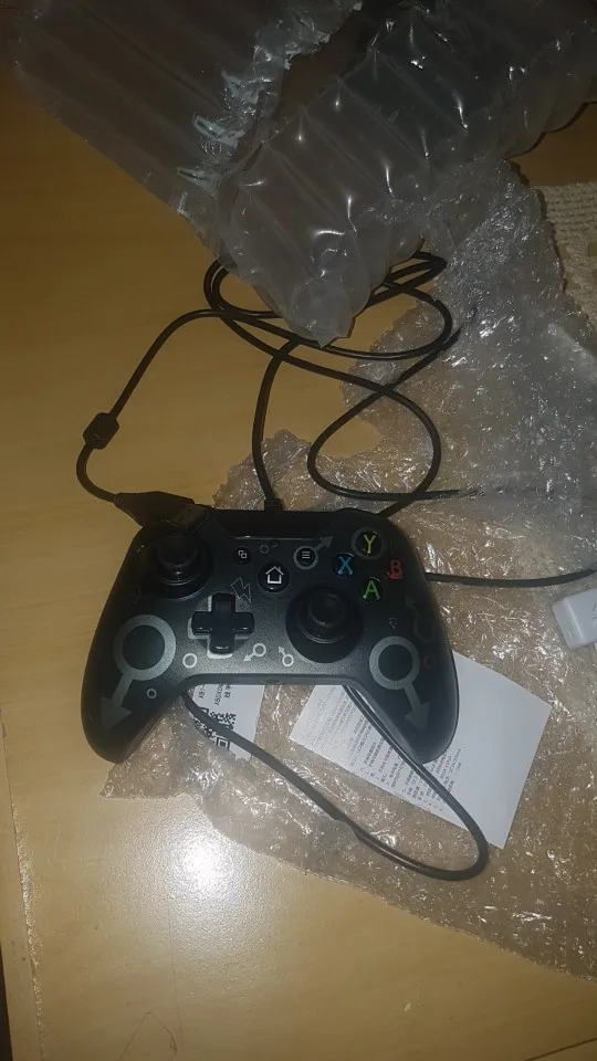 Товар прибывает в течение 14 дней вместо 10 дней. Упаковано под пузырчатый пластиковый конверт без коробки, повреждения. Мини-подставка для смартфона из 2 частей сопровождается упаковкой. Ммм. Короткий контроллер для руки и слишком толстый. Довольно легкий с USB кабелем более 2 метров, отлично. Windows 10 сразу же распознает как контроллер X-box One без драйвера или регулировки. Хороший момент здесь. Вибрация контроллера работает довольно сильно, и разъем для наушников X-box распознан без проблем. Довольно хороший продукт, если вы не обращаете слишком много внимания на его объем в толщину. Рукоятка менее хороша по сравнению с более тонким контроллером Nvidia.