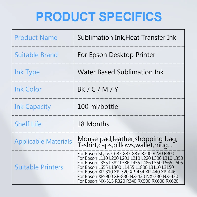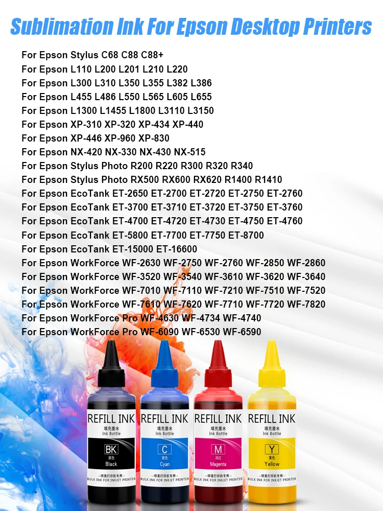 100 мл, 4 цветанабор, сублимационные чернила для Epson ET-2720 ET-2760 ET-2750 ET-15000 ET-4700 ET-3760 WF-7710, принтер для всех моделей