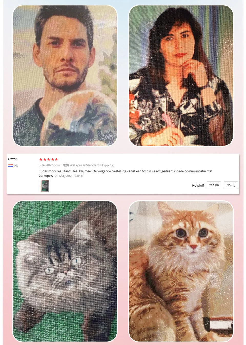 Я только что получила посылку и сразу принялась выкладывать картину, точнее портрет, мне очень понравилось что доставили быстро и прилагается специальный набор для выкладки. Пока все отлично, как закончу картину, поделюсь фото. Так здорово что можно заказать портрет и потом любоваться на него. Продавец молодец, отвечает быстро, уточняет детали. Рекомендую, цена суперская.