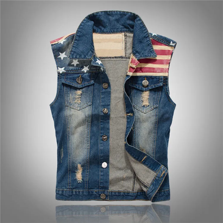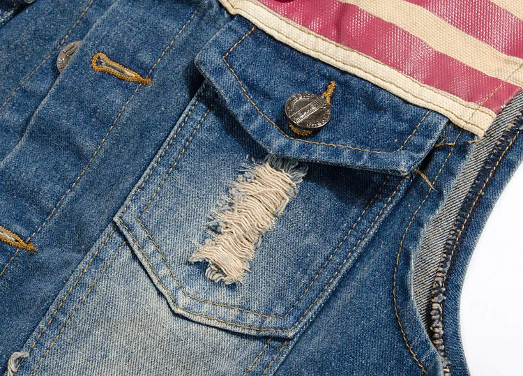 Мужская рваная джинсовая жилетка без рукавов с американским флагом