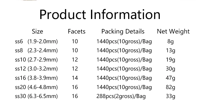 Rhinestone Hot Fix SizeSS6| SS8| SS10| SS16| SS20| SS30|