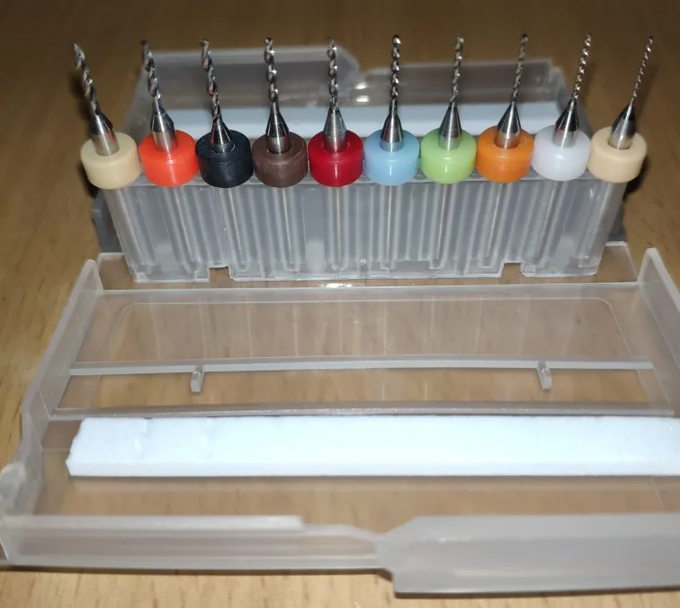 Заказ дошел до Подмосковья в консолидированном отправлении за 18 дней с момента оплаты. Удобная коробка. Сверла не совсем логично промаркированы цветными колечками, отсутствует логичность цветной гаммы, три сверла с одинаковыми зелеными маркерами, размер сверла присутствует только на двух маркерах. На хвостовиках присутствует маркировка размерности сверла, но не на всех хорошо читаемые, поэтому сверла можно перепутать. Хвостовик у всех с очень точным размером - 3,17мм. Сверла хорошего качества и с хорошей заточкой. Сталь сверлить не пробовал. Дерево, пластик, стеклотекстолит - как по маслу. За свою цену отличные сверла.