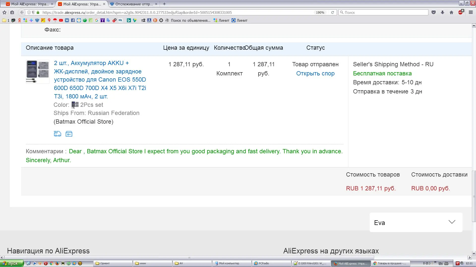 Баиарейки работают отлично на Canon 600d, зарядное устройство компактное и удобное, также работает отлично. Посылку отправили через несколько дней, номер отслеживался. Единственный минус в доставке, пришло за полтора месяца, но срок доставки стоял 2 недели и продавец его не продлил, поэтому статус заказа стоял '' посылка доставлена'', хотя по факту нет. Сначала открыла спор, но продавец уверил, что посылка точно дойдёт... Поверила, сняла и действительно, все дошло:)