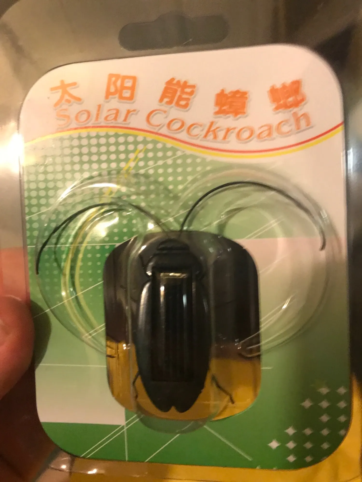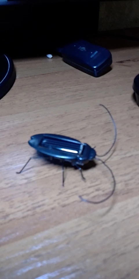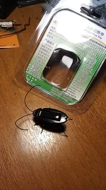 приехал таракан, внутри у него моторчик и на прямую подключен солнечный элемент, он должен двигаться от вибрации моторчика, ламы не движутся, от лампы не работает, только если вплотную поднести, если прямые солнечные лучи то работает, при дневном свете нет, видимо придется кошке играться отдать.