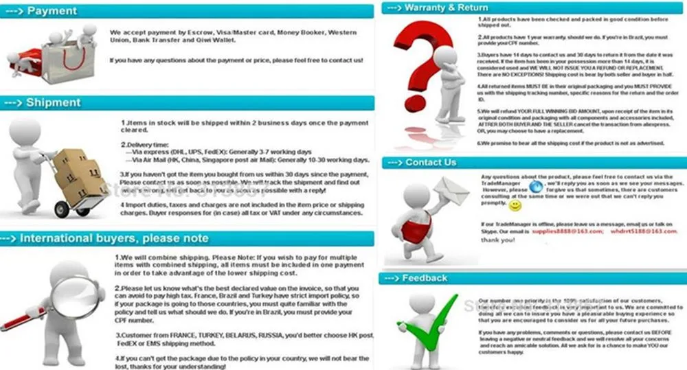 1. Принимаются OEM/ODM Высокое качество, разумная цена, доставка в срок 2. Доставка Мы выбираем 2 кг ниже (китайские почтовые пакеты), Обычная доставка занимает около 30-50 дней; Особые обстоятельства могут задержать доставку; Вы также можете выбрать (UPS, FedEx. DHL.); В зависимости от времени доставки это не тот регион; (TNT.UPS FedEx. Плата.) И тому подобное; Обычное время обработки может занять около 4-8 дней, за исключением исключительных обстоятельств; Оформление задержки оформления может привести к задержке доставки, это нормальное явление; Надеемся на понимание! Если вы выбираете (DHL.EMS.UPS. Номер FedEx.) При любом способе транспортировки; Мы будем основываться на посылке по конкретной стране; Для точного выбора (самого быстрого и безопасного) вида транспорта мы выбираем (быстрая точная доставка) для этой цели; Если нет (иное указано), мы выбрали вид транспорта-это окончательное решение по выбору! 3. Отгрузка 1. Широкая доставка по всему миру. (За исключением некоторых стран и армейской почтовой службы/почтовых отделений флота). Мы отправляем наши товары DHL / EMS и авиа-отправление Почты Китая. 2. После получения оплаты; (в течение установленного срока доставки) доставка! При заказе мы грузим только на подтвержденные адреса. Адрес Вашего заказа должен совпадать с адресом доставки. 3. Время доставки определяется перевозчиком и не включает выходные и праздничные дни. Сроки доставки могут меняться, особенно во время курортного сезона. 4. Если вы не получили посылку в течение 30 дней с момента оплаты, пожалуйста, свяжитесь с нами. Мы Отследим доставку и свяжемся с Вами в кратчайшие сроки с ответом. Наша цель – удовлетворение клиентов! 5. В связи со статусом на складе и разницей во времени мы отправим ваш товар с первого доступного склада для быстрой доставки. 4. Политика доставки: Убедитесь, что вы указали правильный адрес доставки и телефон. Все товары будут отправляться только на указанный вами адрес доставки. 5. Условия оплаты: 1. Полная оплата должна быть произведена в течение 15 дней с момента размещения заказа. 2. Покупатель несет ответственность за любые налоги и/или пошлины, взимаемые его страной. 6 Отзывы: (100% приятный опыт покупок здесь-наша цель) удовлетворение потребностей клиентов очень важно для нас. Пожалуйста, оставьте положительотзывы в. Мы можем работать вместе для этого.