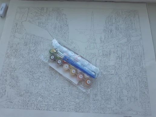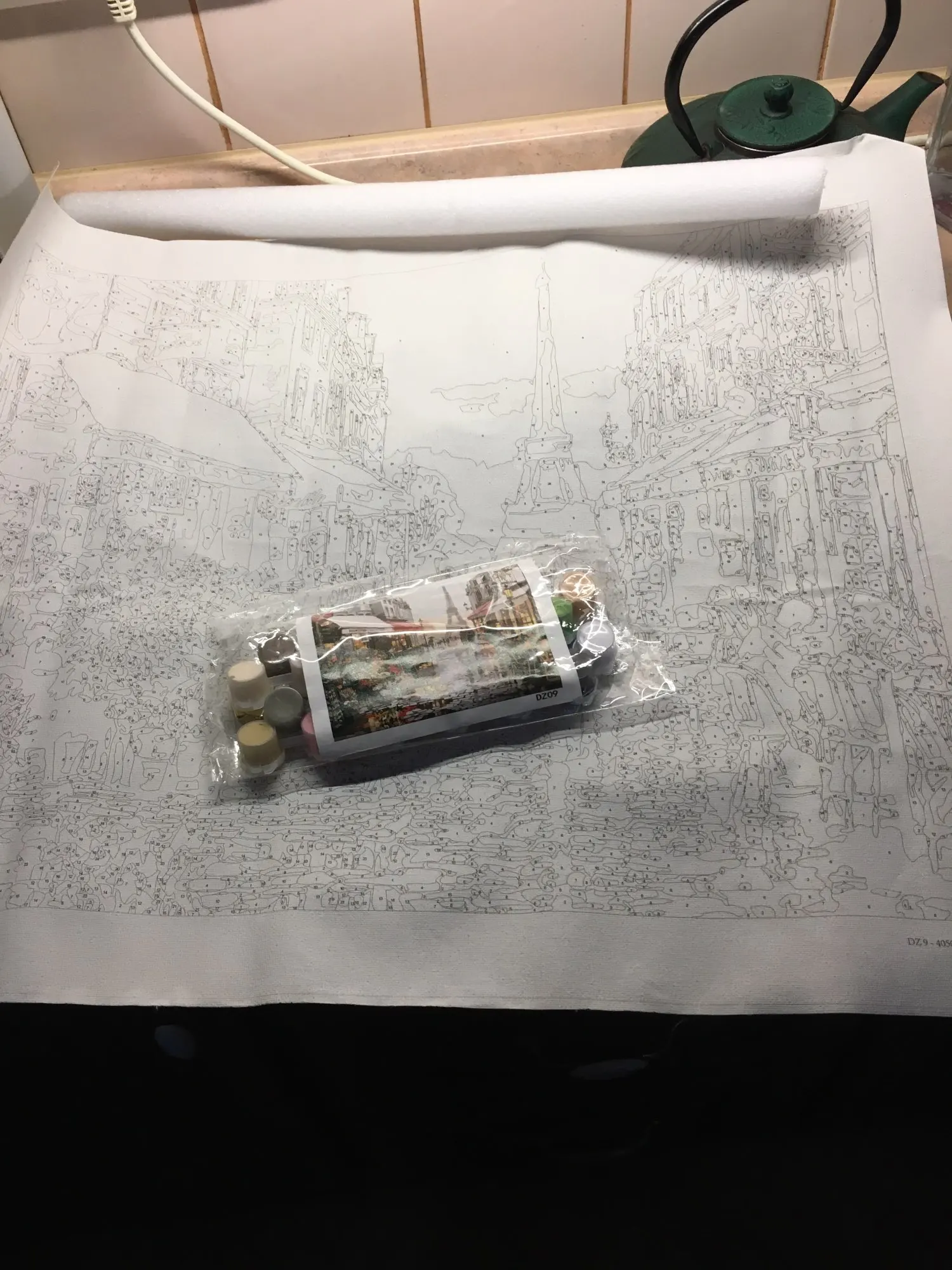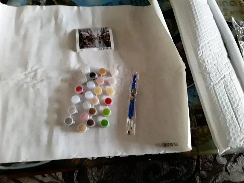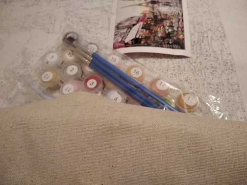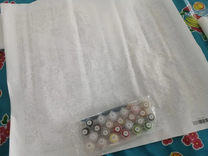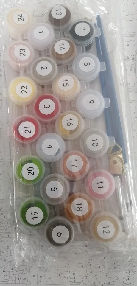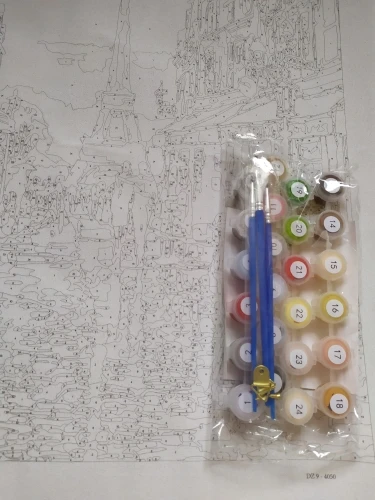Заказ пришёл за 3 недели. Упаковка не очень, холст намотан на валик и сверху один целофан. Холст чудом не помялся. Детали достаточно мелкие. Линии и номера четкие и яркие. Цветов 24 шт, в комплекте 2 набора красок. Доп. схемы с номерами нет.