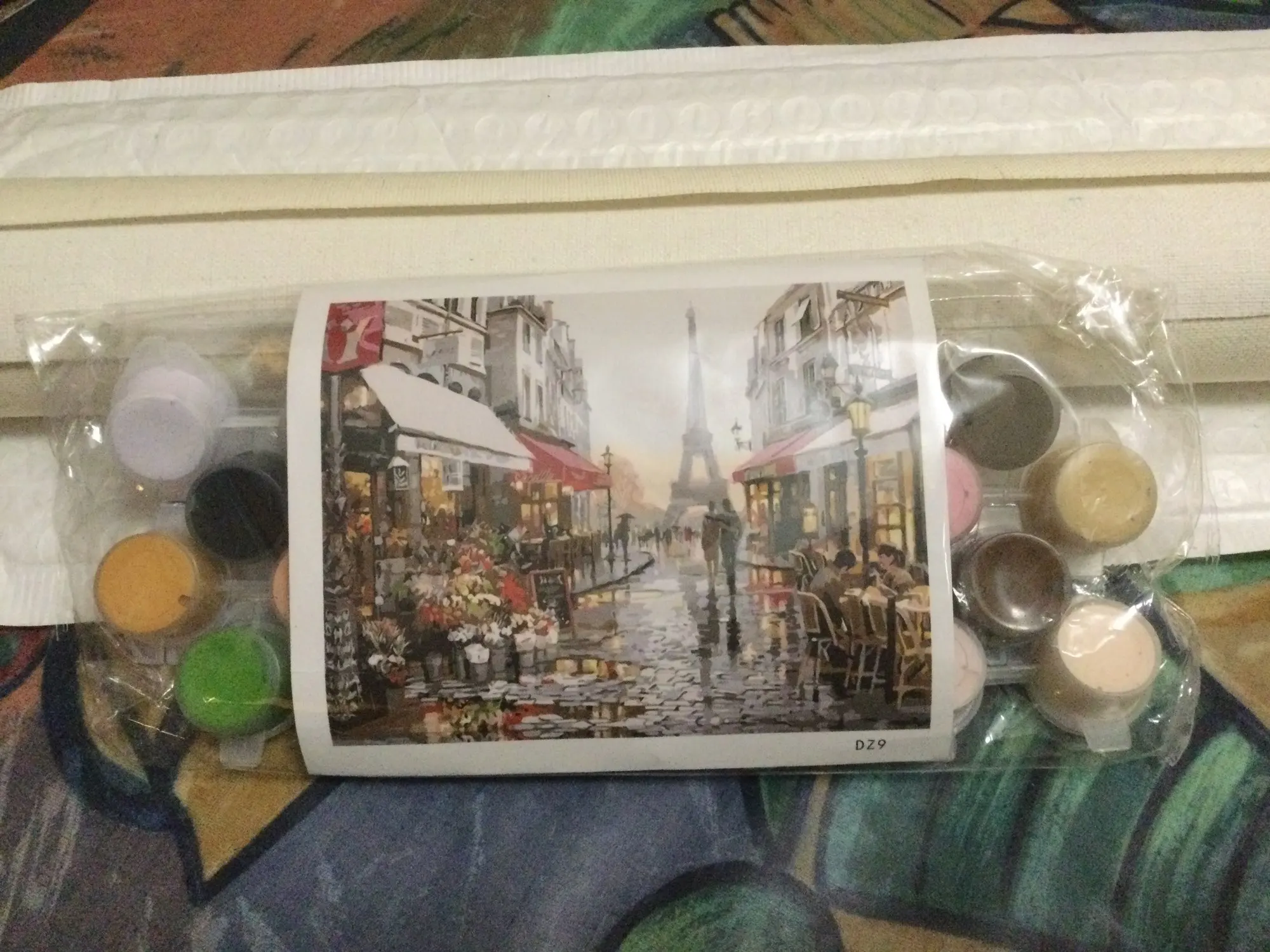 Доставка чуть больше 1-го месяца. Все целое, упаковано в «пупырку»и всё.В наборе холст, краски, три кисточки, рамка (в разобранном состоянии), кнопки, петельки на рамку 2шт и к ним 2 винтика, пример-картинка.