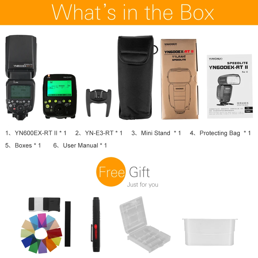 Светодиодная лампа для видеосъемки YONGNUO YN600EX-RT II 2,4G Беспроводной вспышка для фотокамер Speedlite HSS 1/8000s мастер Вспышка Speedlite для Canon Камера как 600EX-RT YN600EX RT + подарочный наборОсобенности: