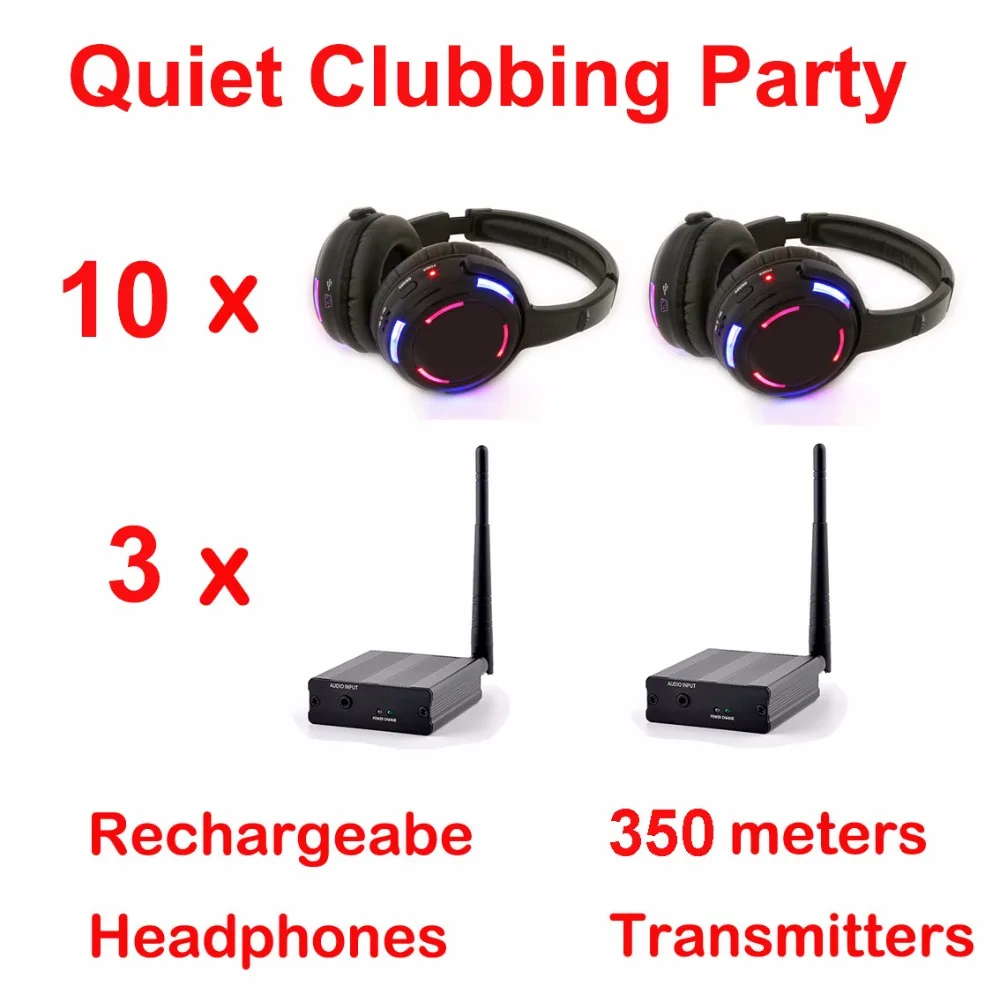 Бесшумные черные светодиодные Беспроводные наушники с полной системой дискотеки-тихие вечерние наушники (10 наушников + 3 передатчика)