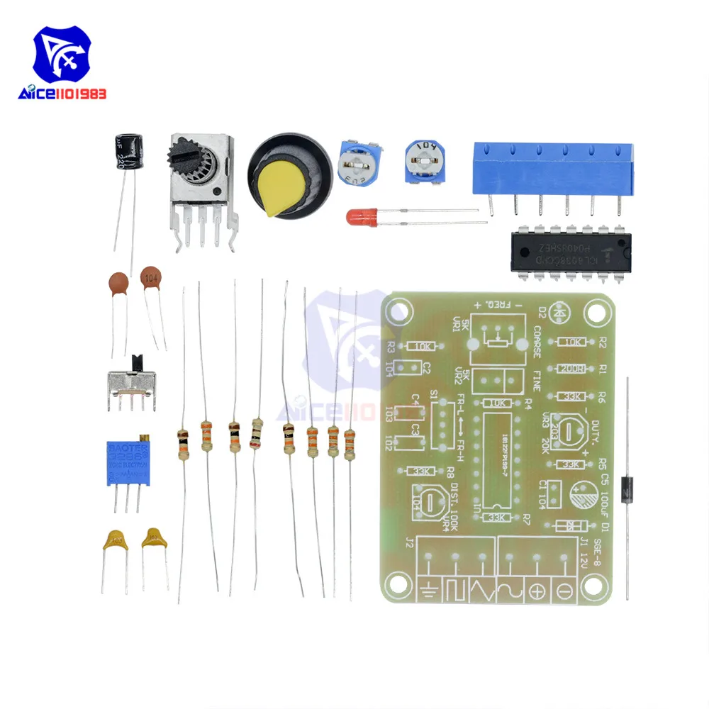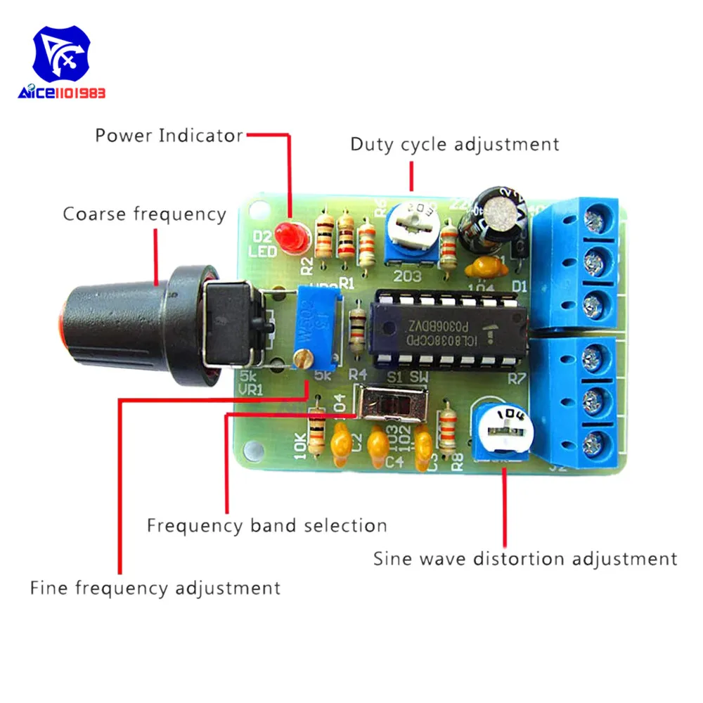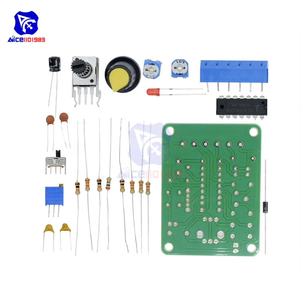 Характеристика:С отличной производительностью асинхронный генератор ICL8038, добавьте небольшое количество резистивных и емкостных компонентов, может производить синусоидальную, треугольную и квадратную волну, а также частоту сигнала, рабочий цикл, регулируемая Синусоидальная волна искажений.Примечание:Требуется определенная способность DIY, вам нужно самостоятельно сварить комплектОписание:ICL8038 pin функции:1 фут, 12 фут: регулятор синусоидальной формы;2 ступня: Синусоидальная волна;3 фута: треугольная волна;4 фут, 5 фут: регулировка частоты и рабочего цикла (или асимметрии формы волны);6 футов: V +, положительный источник питания;7 футов: смещение; 8 футов: регулировка частоты входного терминала;9 футов: квадратный волновой выход.Это открытый коллекторный выходной терминал, работа должна занять нагрузочный резистор на соответствующий положительный блок питания от штыря, чтобы получить ttl-совместимый квадратный волновой выход, сопротивление нагрузки должно быть подключено к источнику питания + 5 В;10 футов: Синхронный конденсатор терминал;11 футов: V-, отрицательный блок питания или земля. Используйте положительный и отрицательный источник питания, 11 футов к отрицательному источнику питания, выходной сигнал симметричен по отношению к 0 В; Используйте один положительный источник питания, 11 футов заземлен, выходной сигнал униполярный, равномерное напряжение + VCC / 2;13 футов, 14 футов: пустая нога.Наборы предназначены для диапазона частот 50-5 кГц, две полосы с переключателем S для переключения, RP1-это регулировка частоты, RP2-регулировка рабочего цикла, RP3-это Регулировка искажений синусоидальной волны. В цепи используется одиночный источник питания 12 В, вход от X1; X2, X3-Выходная сторона формы волны, вы можете использовать осциллограф для наблюдения трех форм выходного сигнала.Модель: ICL8038Входное напряжение: 12 В постоянного токаЧастотный диапазон: 50-5 кГц,Размер: 6 см * 4,5 см * 0,2 смВес: 26 гПосылка включает в себя:1 * Функциональный модуль генератора сигналов DIY kit