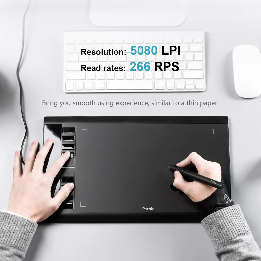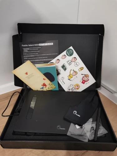 Пришёл за 2 дня, что очень порадовало. В комплекте шли перчатка, стилус, 15 запасных наконечников, инструкция на английском, наклейки и открытка. Сказала драйвер с оригинального сайта, планшет рабочий, на нажатие реагирует, быстрые клавиши настраиваются. Лёгкий и компактный (у меня есть большой планшет, кооторому не только всякие разные чехлы малы, он ещё и в сумку от ноутбука не влезает, поэтому взяла этот для мобильности)