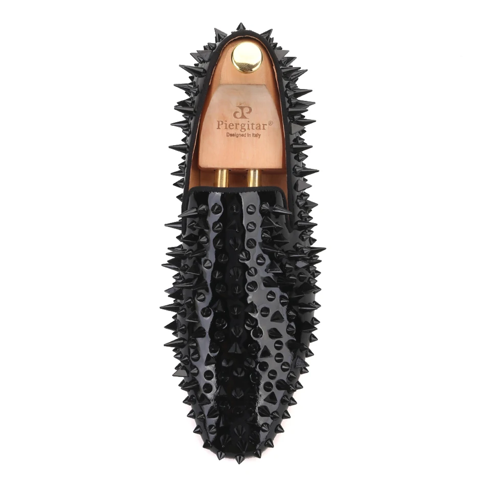 PiergitarНовинка 2019 года; черные мужские туфли ручной работы из лакированной кожи с различными шипами; модные мужские лоферы на плоской подошве для вечеринки