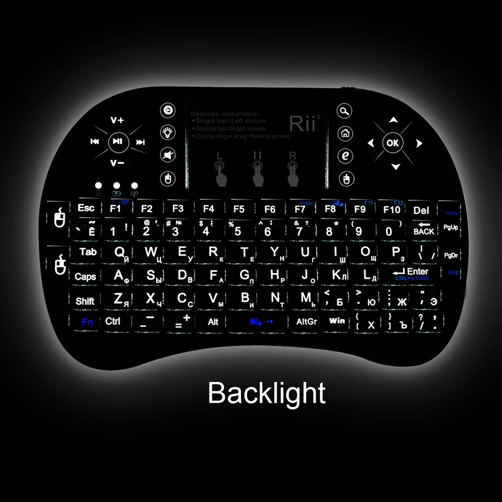 Rii Mini i8 + 2,4G русская беспроводная клавиатура с подсветкой с тачпадом для Android Mini PC, Smart TV Box