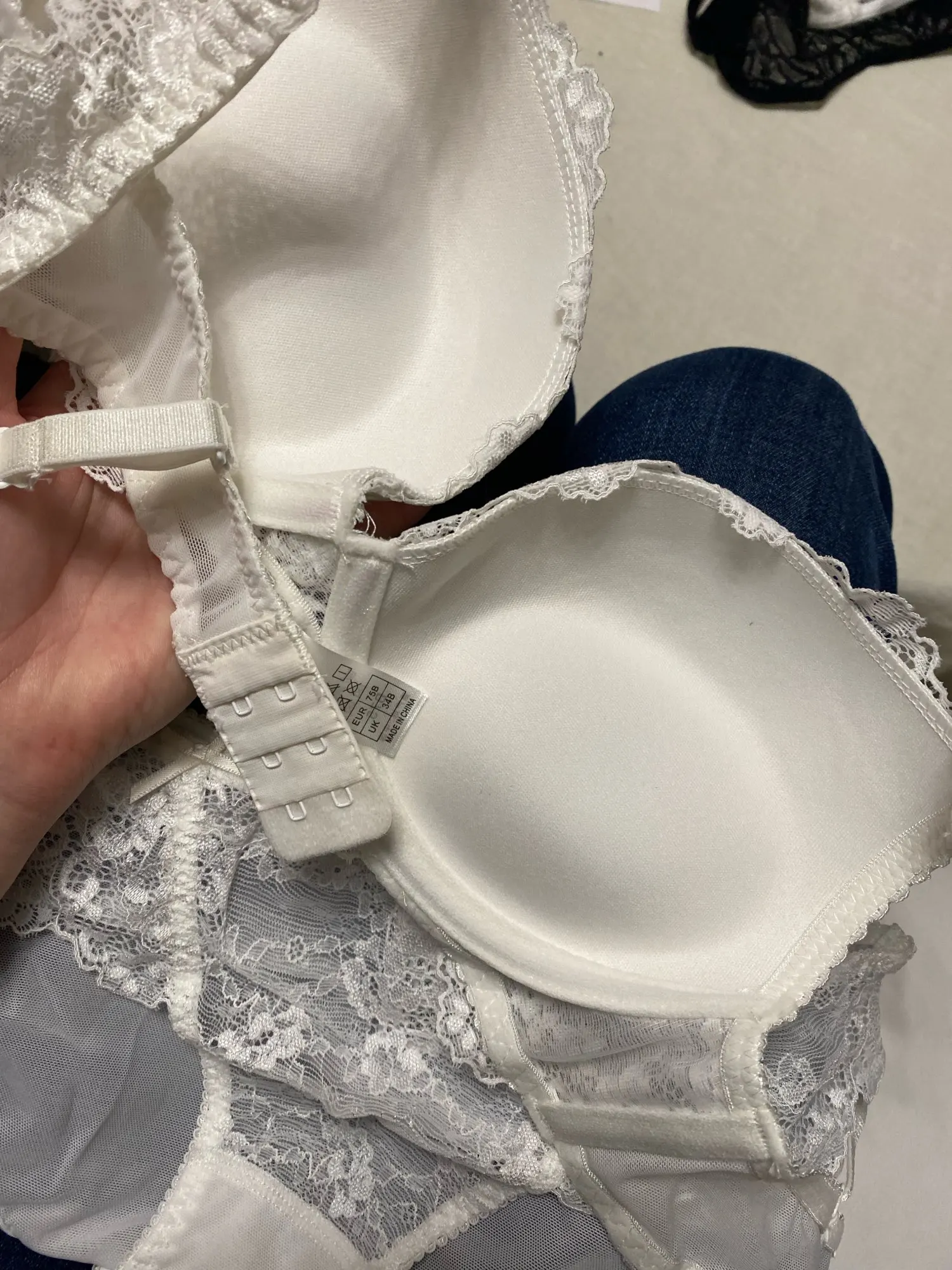 Я взял 85B, 85 ОК, с другой стороны шляпа B, не подходит. Это не пуш-ап, а чудо (на фото См. Идеальный пуш-ап по сравнению с полученным пуш-ап)! Слишком большой. Штаны соответствуют 38 ОК, правильно, я поставлю только штаны внезапно 13 евро штаны, слишком дорого.