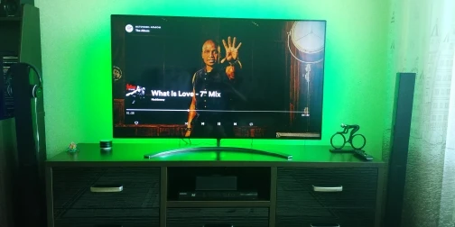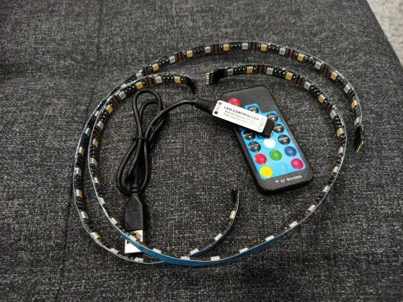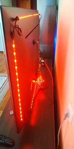 Всё работает. В пульт подошла батарейка 2032. После выключения запоминает последний режим. Приклеилась вроде надёжно. Плохо, что не набрать точную нужную длину без паяльника. На горизонтальные стороны 42" телевизора одной ленты мало, двух - много. Подключил 4 ленты к USB телевизора на 500 мА - светит ярко. Потом когда-нибудь доберу сверху и снизу до нужной длины.
