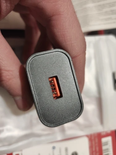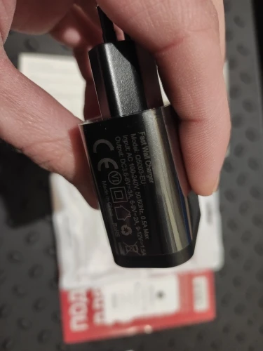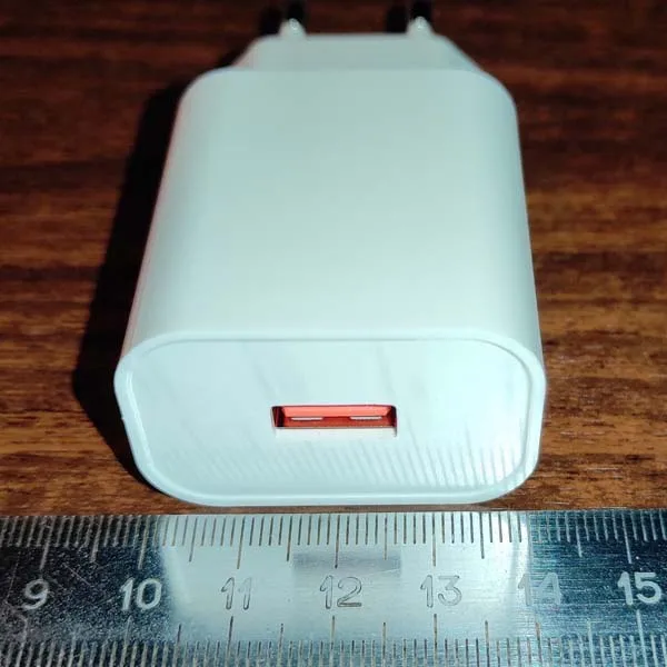 Доставка до Москвы 13 дней, считая со дня оплаты заказа - неожиданно быстро. Изделие выполнено из белого матового пластика, качество изготовления хорошее. Размеры (с учётом вилки): 82*41*26mm, вес 50 граммов. Пробовал заряжать Redmi Note 9 Pro: с 13 до 99% телефон зарядился за 1 час и 40 минут. Первые 40 минут зарядка производилась на мощности чуть менее 17W, зарядное устройство при этом нагрелось незначительно - тёплое на ощупь. При включении без нагрузки, если прислонить ухо к гнезду USB, слышно едва различимое потрескивание. Покупкой доволен.