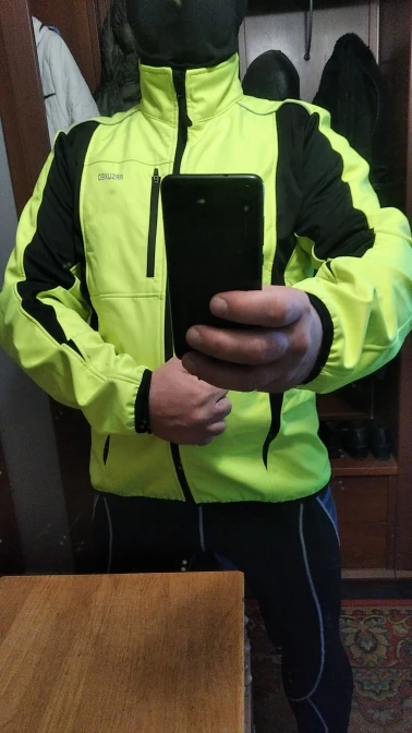 Куртка супер!!! Размер XXL сел на меня -187 см. 92кг. идеально, ничего не висит, длинна куртки и рукава какие надо, при этом не в обтяжку и можно поддеть ещё одну тонкую кофту, на очень холодную погоду(от 5 до -5°С).При этом куртка достаточно тёплая хватит от 17 до 5°С.(уровень тренировок средний).Я бы сказал золотая середина. Если выбирал в магазине то взял бы именно этот размер. Чёрная ткань тянется, зелёная нет, и лёгкий дождик думаю выдержит, не проверял.В карман на груди влезет телефон до 6" размера экрана(самсунг А51 легко), вместительный.На спине без молнии, на резинке. войдёт поллитра... воды)) (русским привет). Боковых карманов нет, привет гопникам))). С отправкой продавец тянул до последнего, и я уже начал злиться на него, но продавец в подарок положил перчатки, и это растопило моё суровое сердце, и доставка была очень быстрой!!!Респект тебе мой китайский друг!!! Очень рекомендую!!!