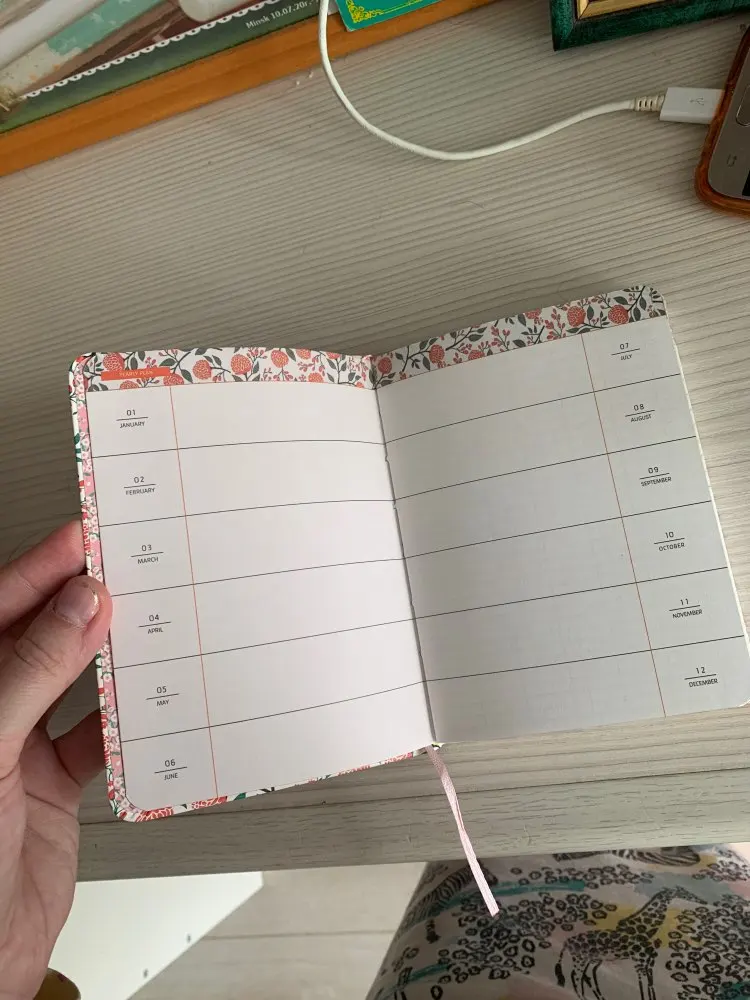 Очень миленький и маленький ежедневник. недатирован, что безумно удобно. В нем можно заполнять планы на год, месяц, а так же еженедельные планы. Оформление симпатичное, обложка не "деревянная", имеется лента-закладка. Большущее спасибо продавцу!