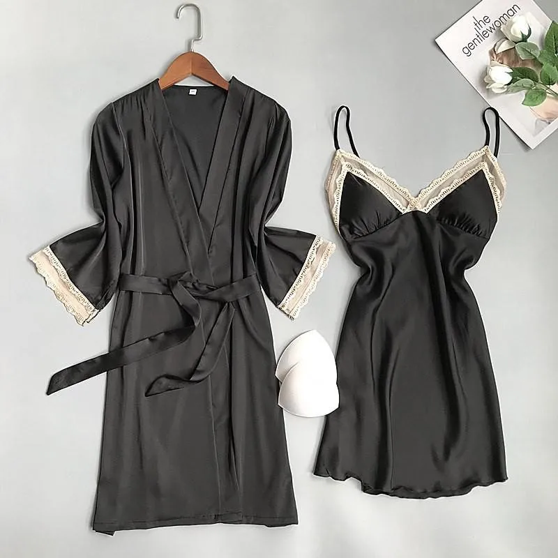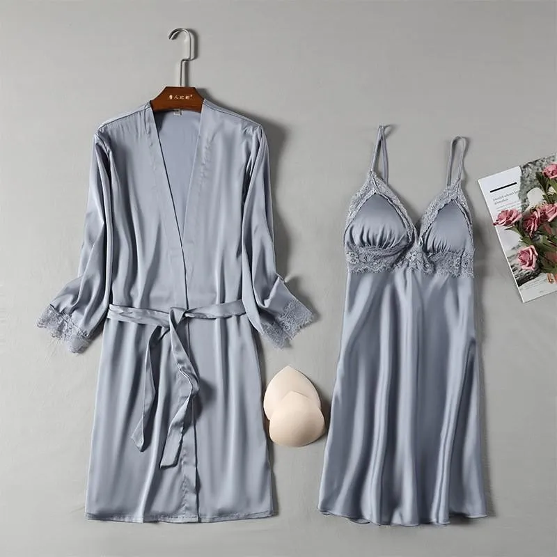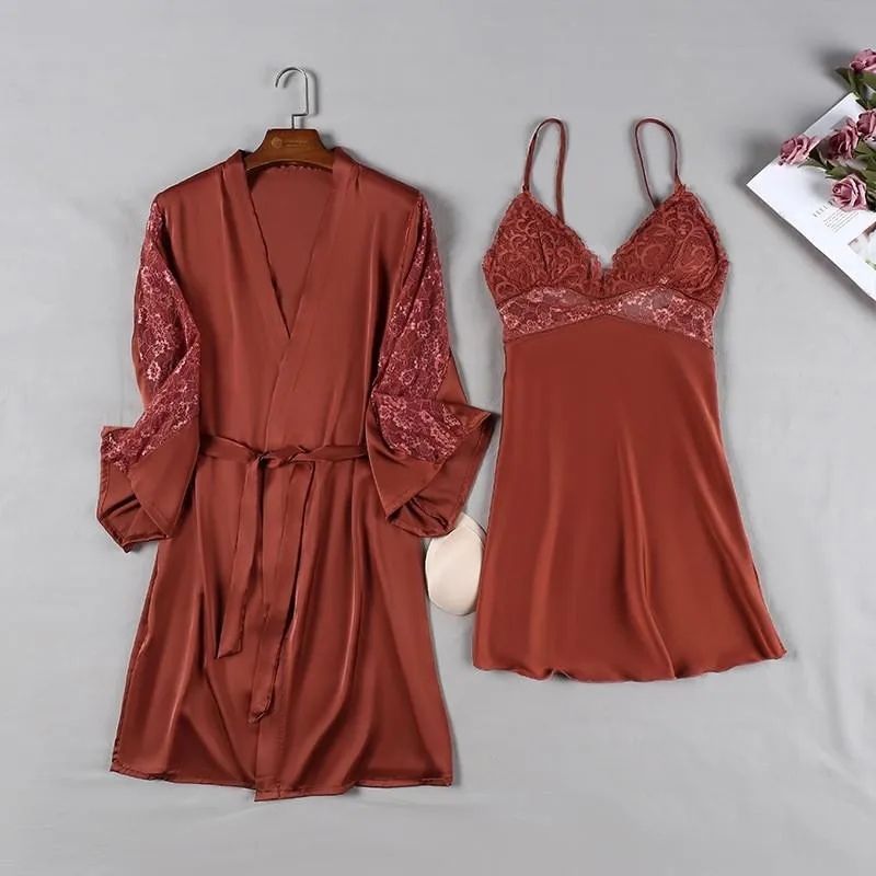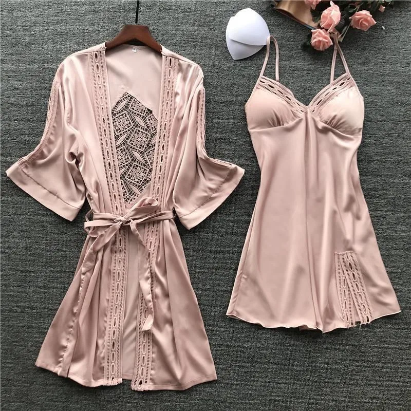 Женская атласная кружевная розовая пижама, комплект из 2 предметов, ночная рубашка, сексуальный женский халат, комплект для невесты, подружки невесты, свадебное платье, M-XL