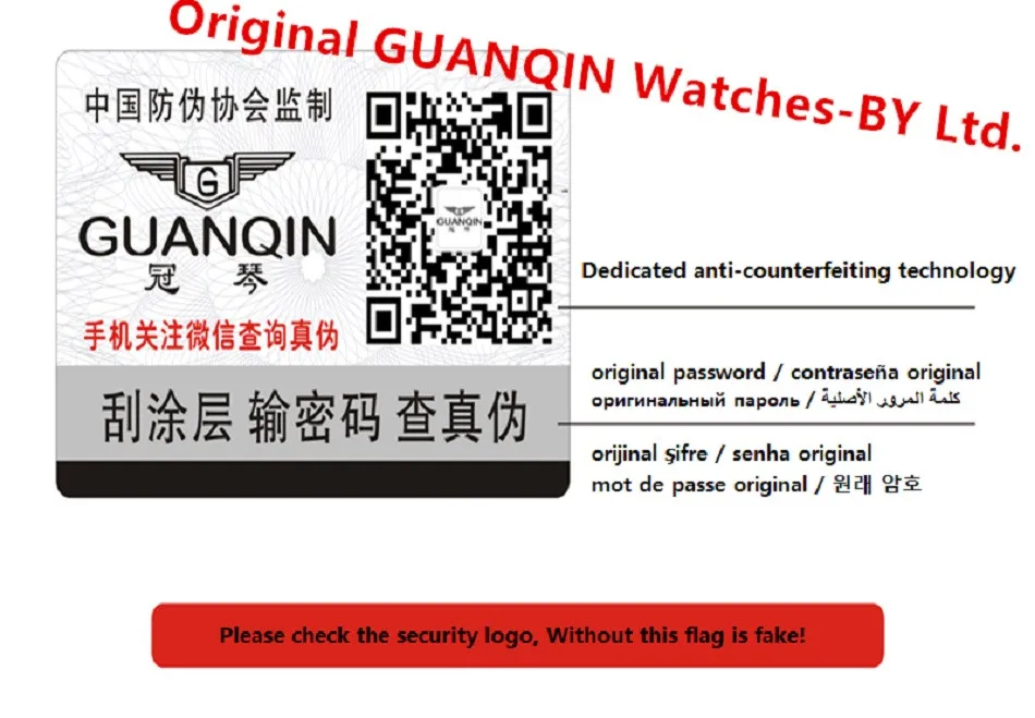 Посылка со списком1 * часы GUANQIN;1 * упаковочная коробка;1 * упаковочный пакет;1 * Инструкция;1 * идентификационная карта подлинности;1 * бирки GUANQIN;1 * салфетка для чистки часов;1 * инструмент для крепления ремешка.