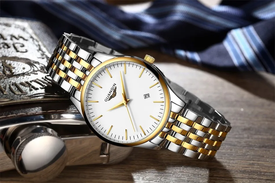 Часы GUANQIN мужские наручные из нержавеющей стали, модные водонепроницаемые кварцевые, с календарем, круглые