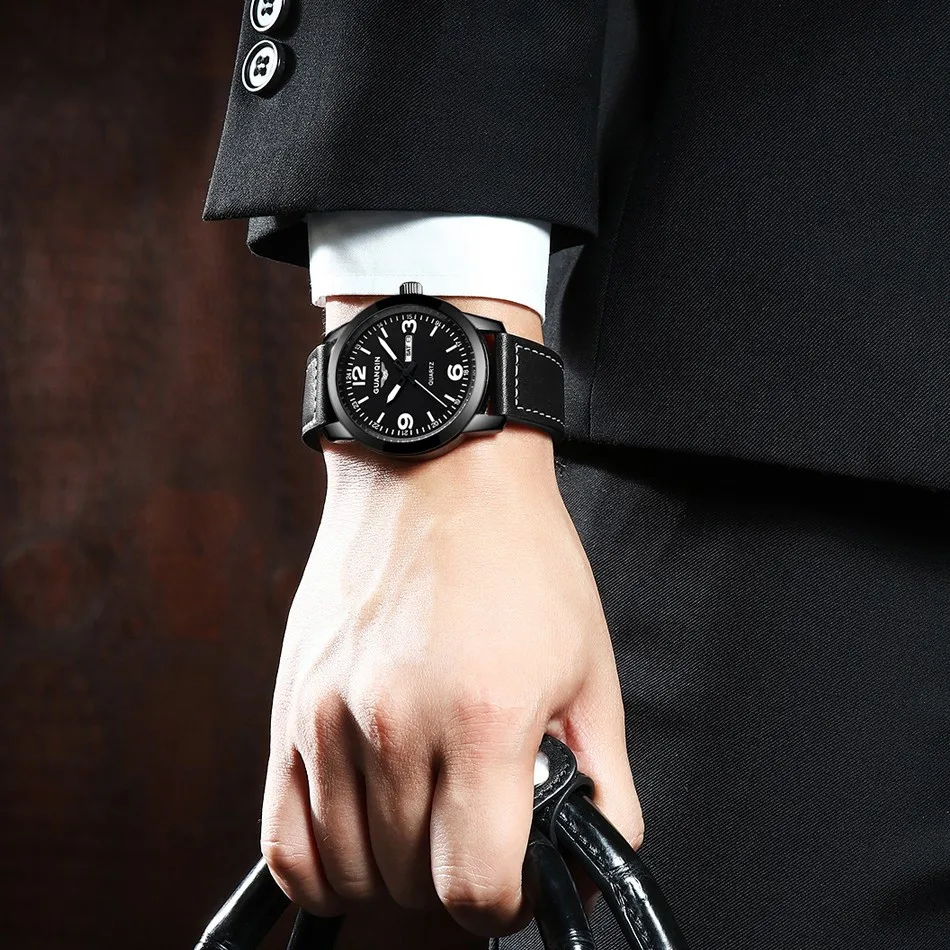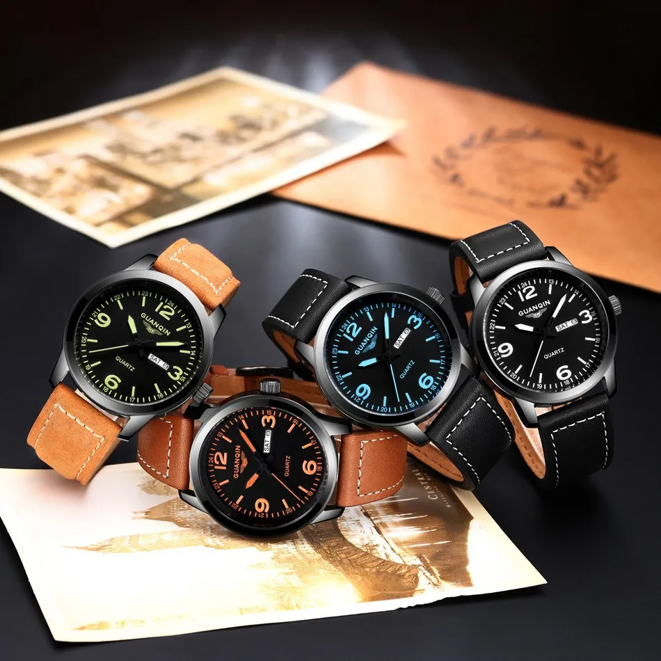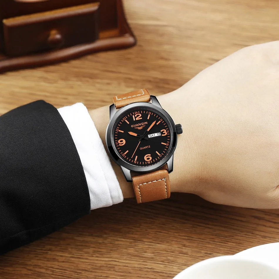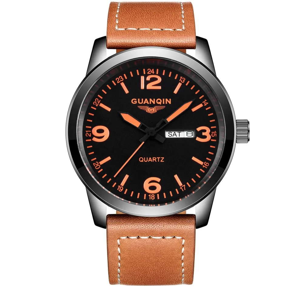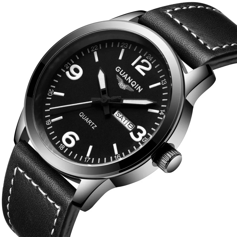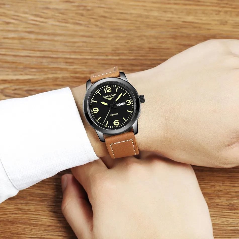Часы наручные GUANQIN мужские деловые, брендовые Роскошные водонепроницаемые кварцевые с кожаным ремешком, с отображением недели и даты