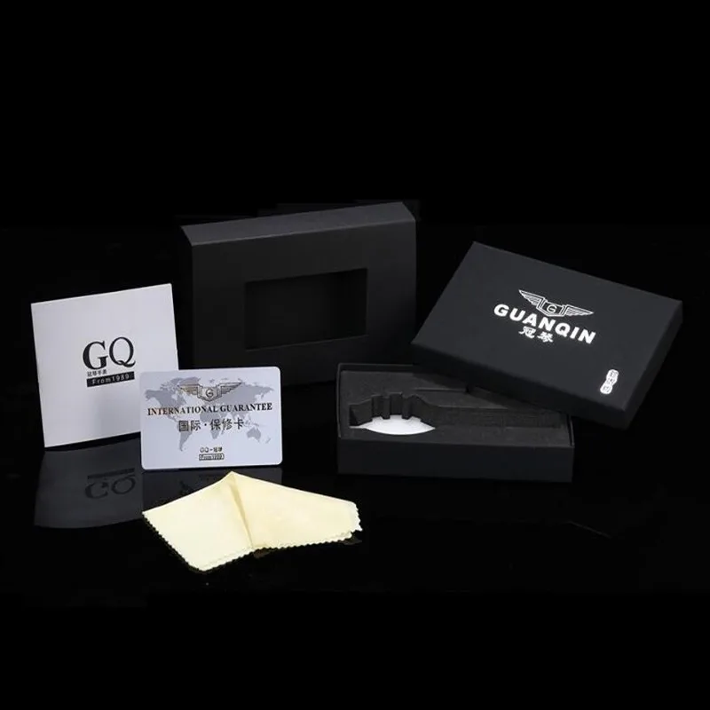 Посылка со списком1 * часы GUANQIN;1 * упаковочная коробка;1 * Инструкция;1 * Международная гарантийная карта;1 * салфетка для чистки часов.