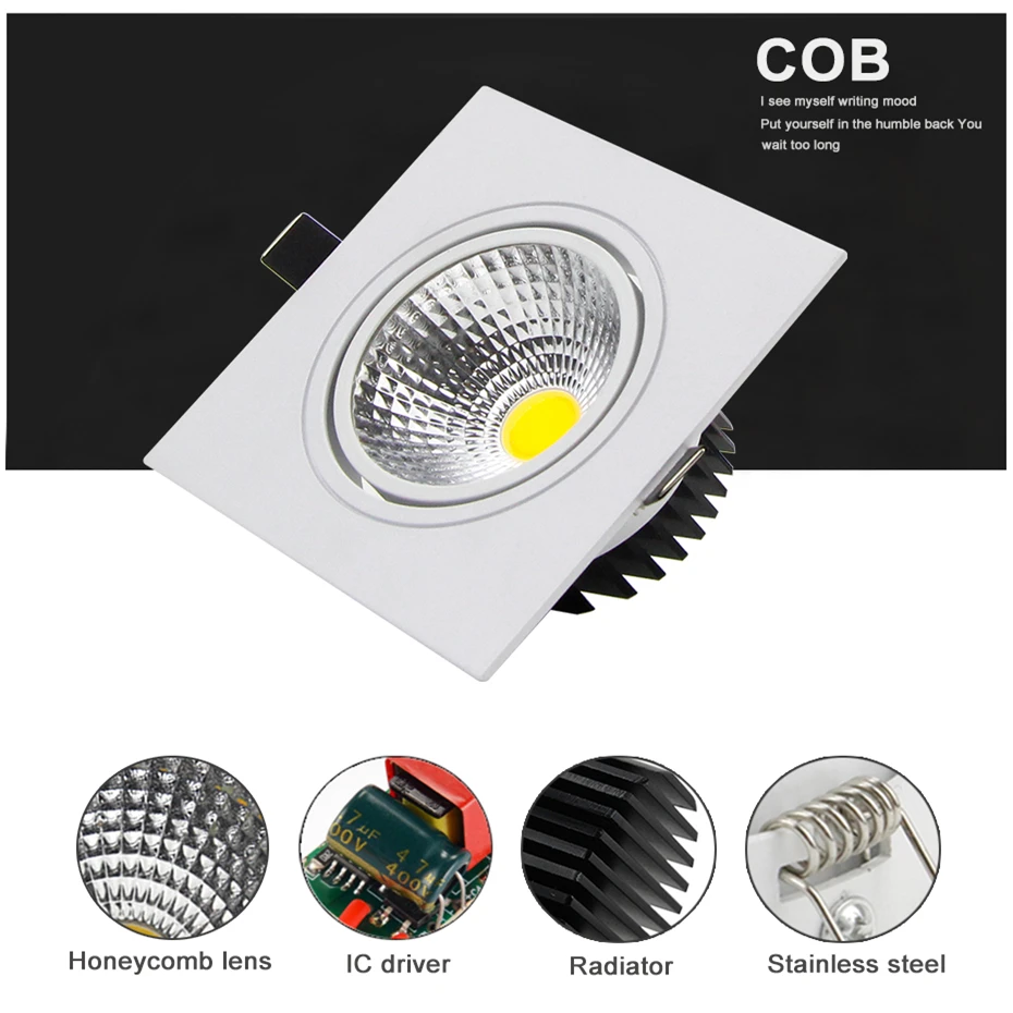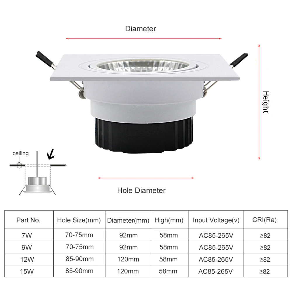 Название продукта: классический квадратный COB светодиодный встраиваемый светильникМатериал: литой алюминийИсточник светодиодов: чип COBМощность: 7 Вт 9 Вт 12 Вт 15 ВтПотребляемая мощность (переменный ток): 86-265V 50/60HzИндекс цветопередачи (CRI): RA>80Цвет корпуса лампы: белыйСветовой поток: 100-110 лм/ВтЦветовая температура: теплый белый (3000-3500K), натуральный белый (4000-4500K), белый (6000-6500K).Рабочая температура: -25 ℃-+ 60 ℃Размер: как на картинкеУгол луча: 45-60 градусовКоэффициент мощности (PF):> 0,95(Чип на плате) Срок службы: 50000 часовГарантия: 2 года