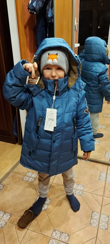 Куртка понравилась. Правда на улицу ещё не одевали, поэтому не могу сказать насколько тёплая. На рост 128 взяла 140. С запасом, как и хотела. Рукава прорезиненные, капюшон пристегивается к воротнику. Сын доволен.