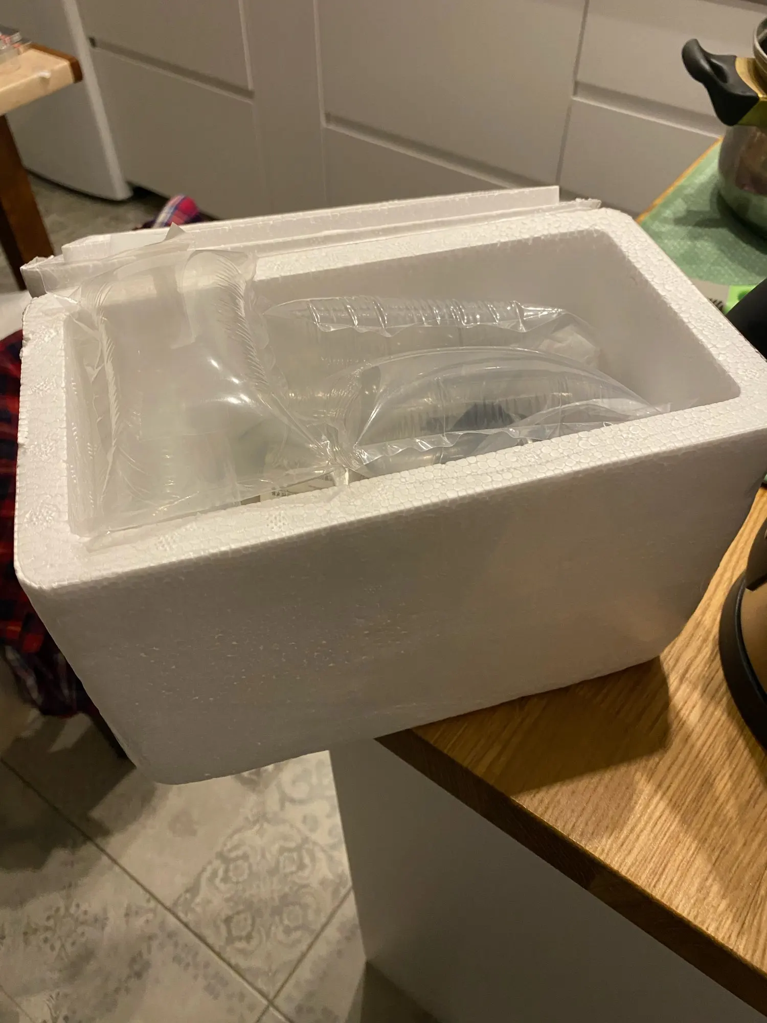 Чайник упакован хорошо. Доехал без повреждений. внутренняя колба полностью из пластика. запах пластика присутствует, надеюсь выветрится. внешняя часть стеклянная.