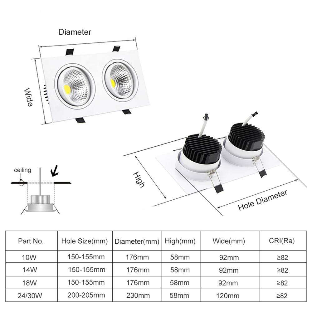 Супер яркий Встраиваемый светодиодный светильник с регулируемой яркостью, 2 головки, квадратный COB светильник с регулируемой яркостью, 10 Вт, 14 Вт, 18 Вт, 24 Вт, потолочный светильник, Точечный светильник 220 В.