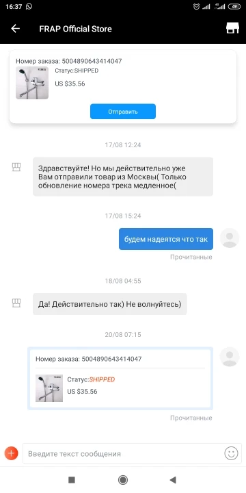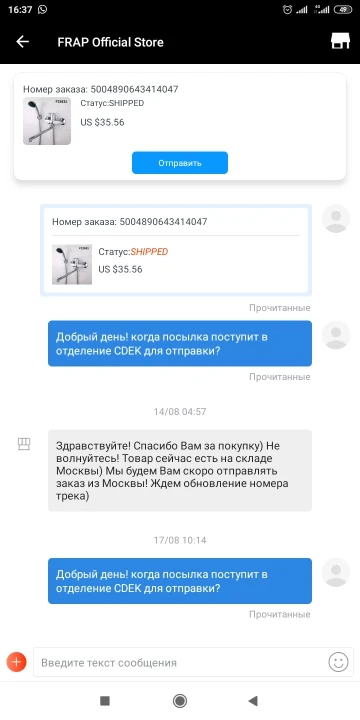 спасибо продавцу.заказаной модели небыло, потом я предложил ему другую модель с доплатой. доплату взял 3 бакса и прислал смеситель который на 20 баксов дороже. респект ему.