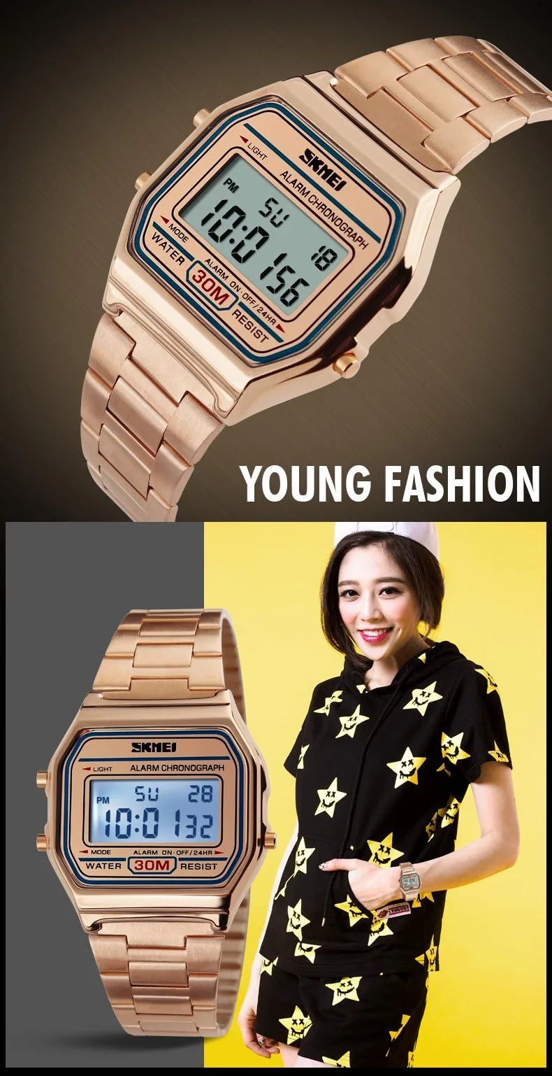 SKMEI Роскошные брендовые светодиодные цифровые спортивные часы, модные повседневные золотые наручные часы, мужские военные водонепроницаемые наручные часы из нержавеющей стали