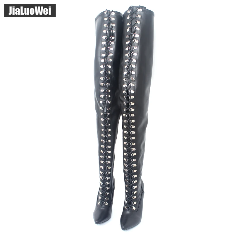Jialuowei Фетиш шнуровка молния промежность гибкий матовый полиуретан высокий каблук выше колена сапоги большого размера 44, 45,46 больше цветов Бесплатная доставка