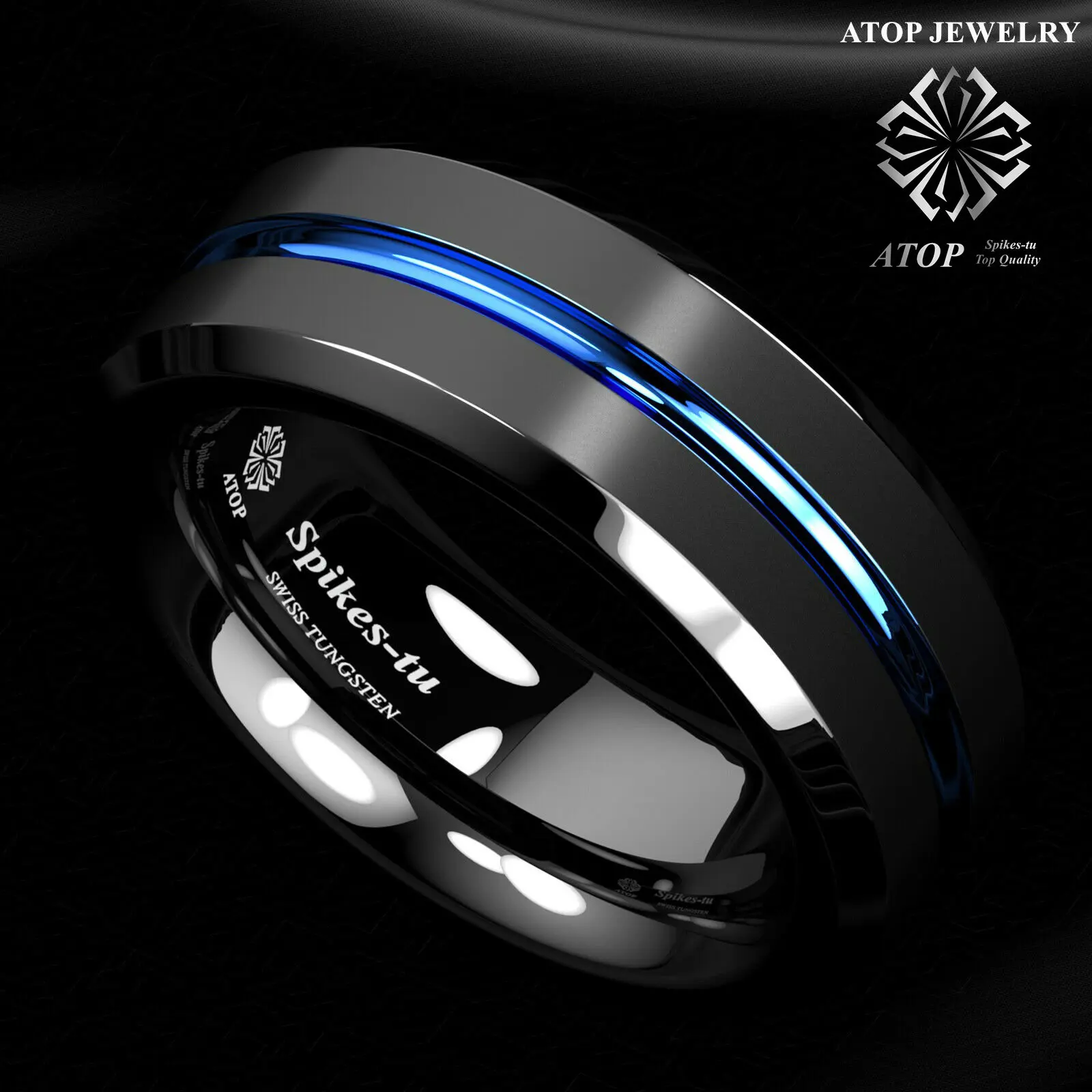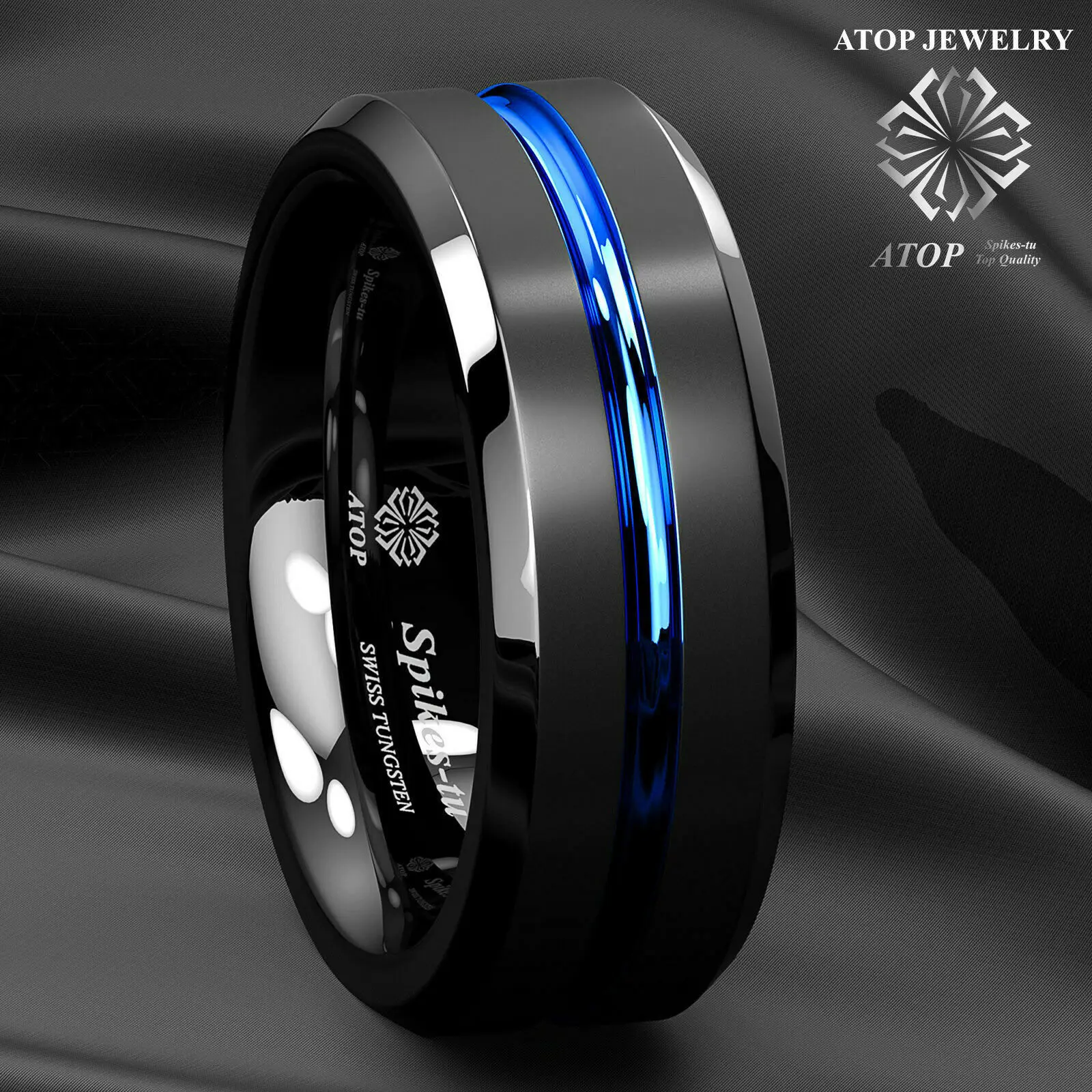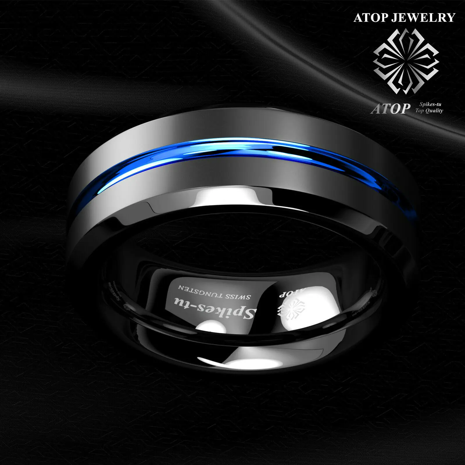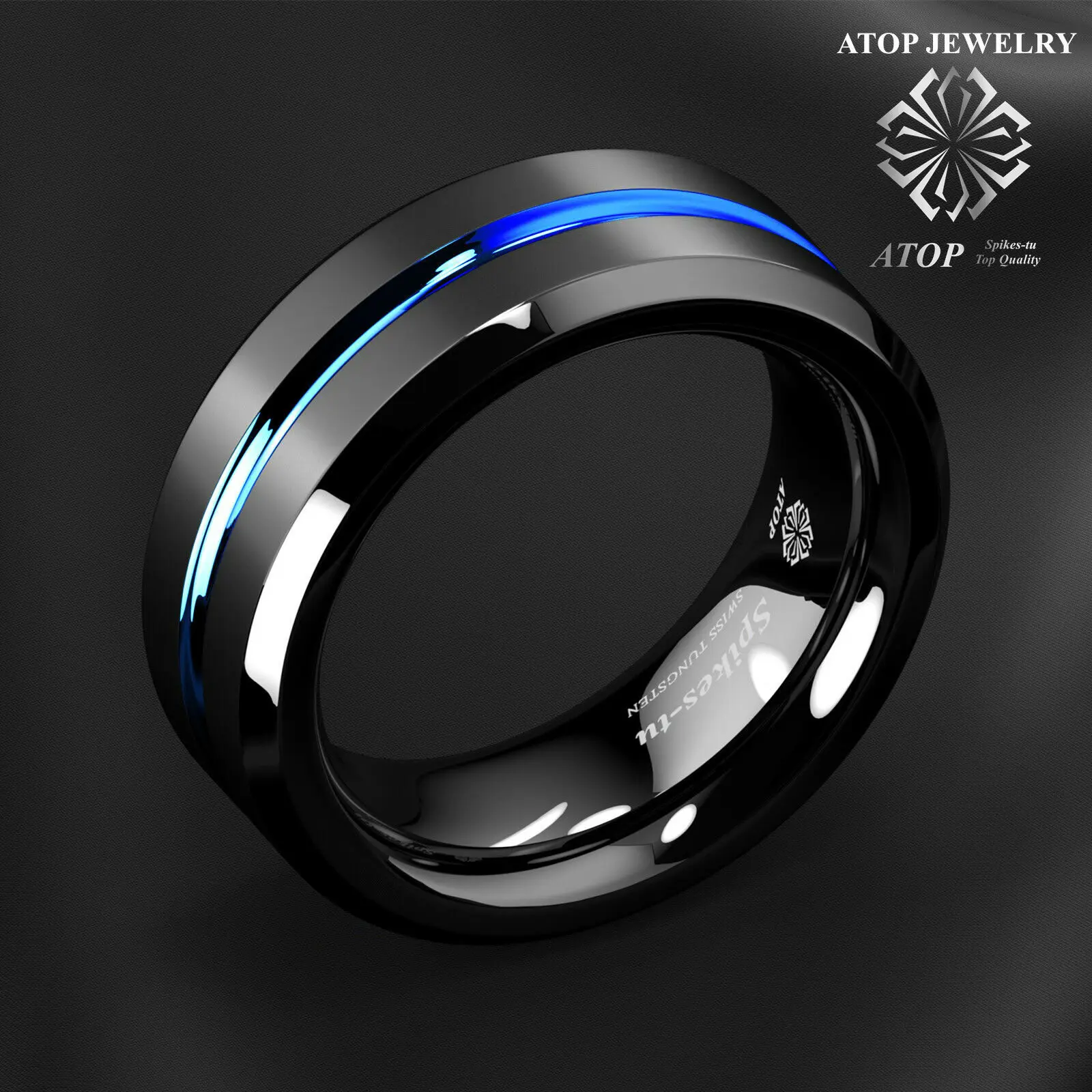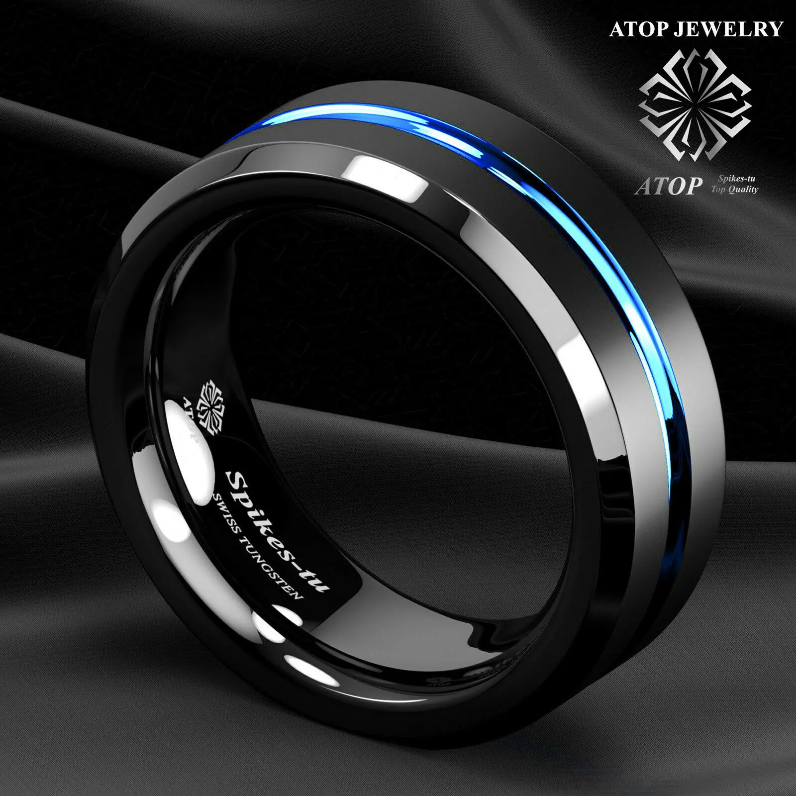 Черное кольцо из карбида вольфрама, мужские ювелирные изделия со скошенной синей полосой