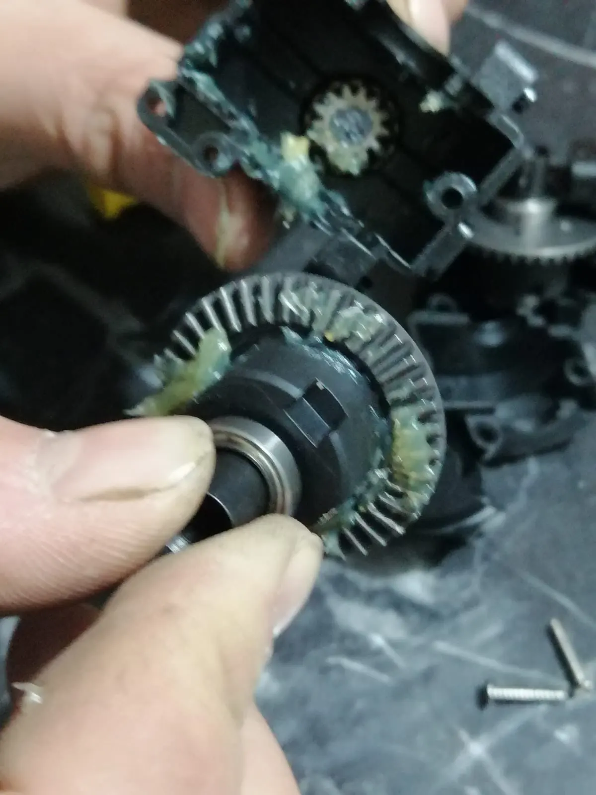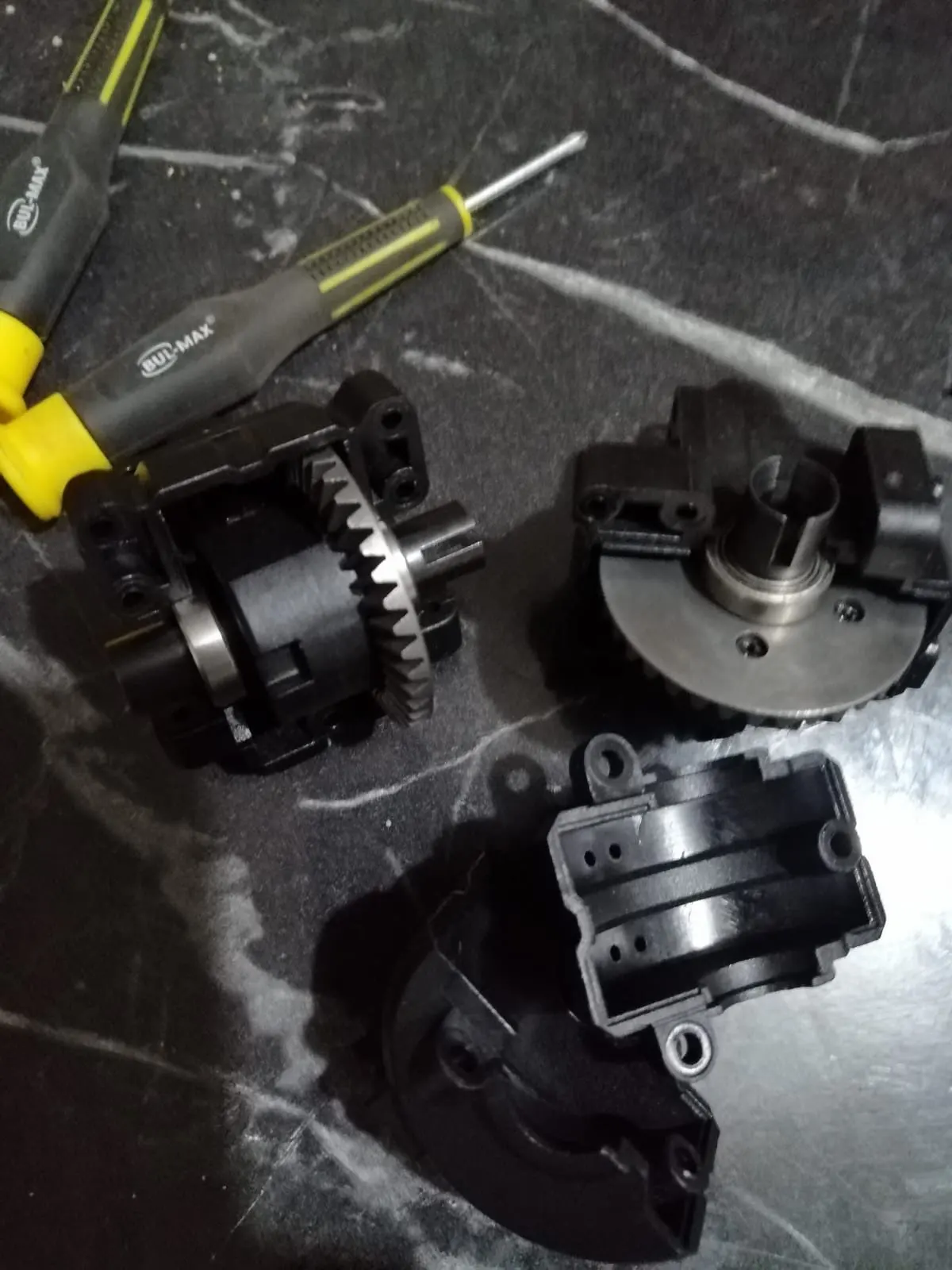 Подшипник на пластиковую половину дифференциала оделся только после доработки напильником, сальников в дифференциале нет, зазор главной пары далёк от идеала.