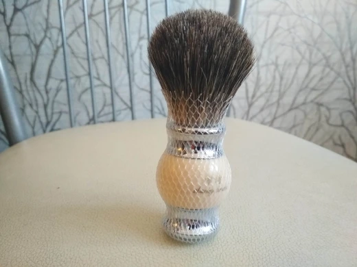 Уверен, что хороший помазок. Внешне красив, тяжёл, лохмат. Цвет ручки похож на бильярдный шар из слоновой кости. Приятно, дорого. Металл, а не пластик с покрытием, придаёт брутальную тяжесть ручке. Щетина очень похожа на натуральную. Даже по запаху. Слегка так пахнет котиками. По жёсткости - медиум. Узел тугой, плотный. Своих девять сотен уж точно стоит. "Из России" - неделя. Фирменный знак IML, - помятая коробка - присутствует.